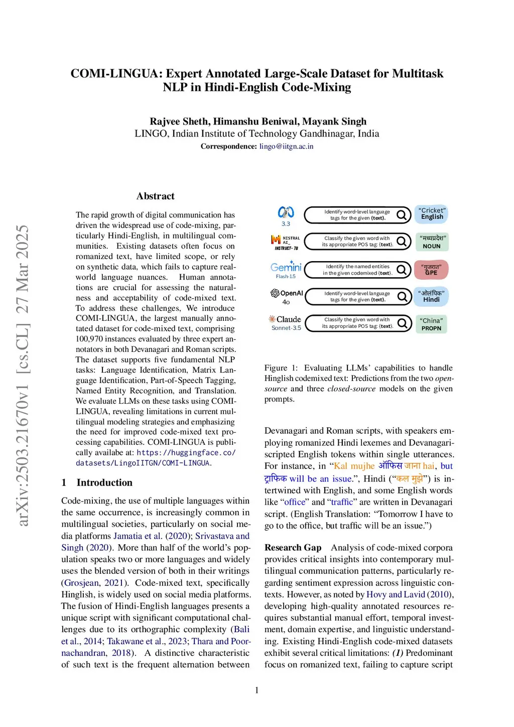 We introduce COMI-LINGUA, the largest manually annotated Hindi-English code-mixed dataset, comprising 125K+ high-quality instances across five core NLP tasks: Matrix Language Identification, Token-level Language Identification, Part-Of-Speech Tagging, Named Entity Recognition, and Machine Translation. Each instance is annotated by three bilingual annotators, yielding over 376K expert annotations with strong inter-annotator agreement (Fleiss' Kappa 0.81). The rigorously preprocessed and filtered dataset covers both Devanagari and Roman scripts and spans diverse domains, ensuring real-world linguistic coverage. Evaluation reveals that closed-source LLMs significantly outperform traditional tools and open-source models in zero-shot settings. Notably, one-shot prompting consistently boosts performance across tasks, especially in structure-sensitive predictions like POS and NER. Fine-tuning state-of-the-art LLMs on COMI-LINGUA demonstrates substantial improvements, achieving up to 95.25 F1 in NER, 98.77 F1 in MLI, and competitive MT performance, setting new benchmarks for Hinglish code-mixed text. COMI-LINGUA is publicly available at this URL:this https URL.