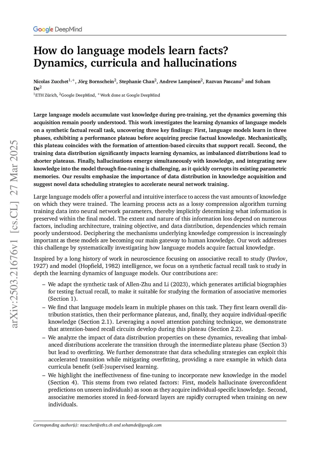 How do language models learn facts? Dynamics, curricula and hallucinations