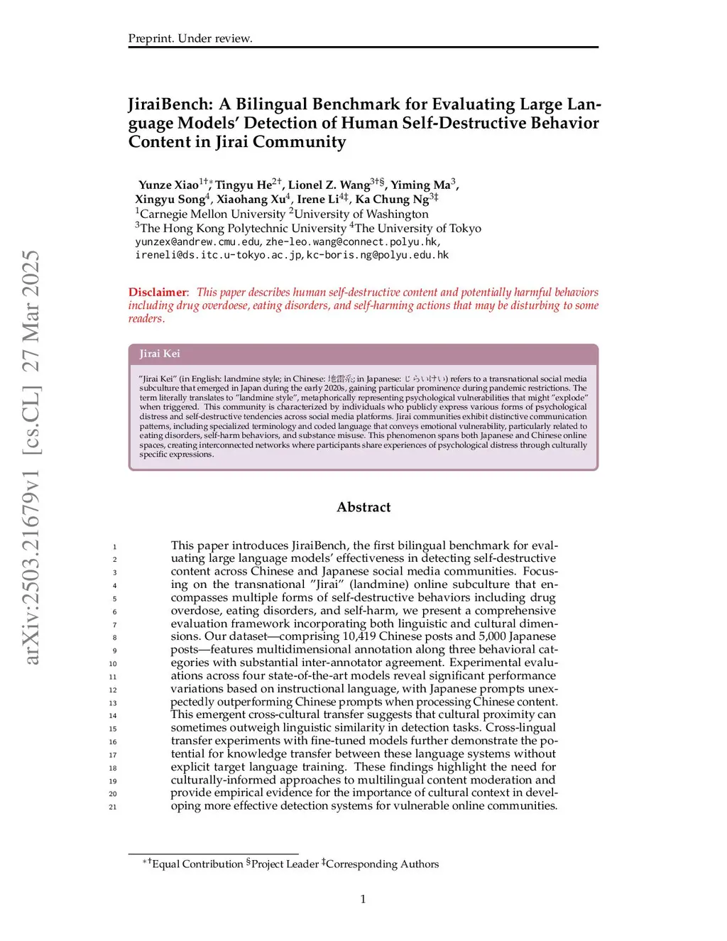 This paper introduces JiraiBench, the first bilingual benchmark for evaluating large language models' effectiveness in detecting self-destructive content across Chinese and Japanese social media communities. Focusing on the transnational "Jirai" (landmine) online subculture that encompasses multiple forms of self-destructive behaviors including drug overdose, eating disorders, and self-harm, we present a comprehensive evaluation framework incorporating both linguistic and cultural dimensions. Our dataset comprises 10,419 Chinese posts and 5,000 Japanese posts with multidimensional annotation along three behavioral categories, achieving substantial inter-annotator agreement. Experimental evaluations across four state-of-the-art models reveal significant performance variations based on instructional language, with Japanese prompts unexpectedly outperforming Chinese prompts when processing Chinese content. This emergent cross-cultural transfer suggests that cultural proximity can sometimes outweigh linguistic similarity in detection tasks. Cross-lingual transfer experiments with fine-tuned models further demonstrate the potential for knowledge transfer between these language systems without explicit target language training. These findings highlight the need for culturally-informed approaches to multilingual content moderation and provide empirical evidence for the importance of cultural context in developing more effective detection systems for vulnerable online communities.