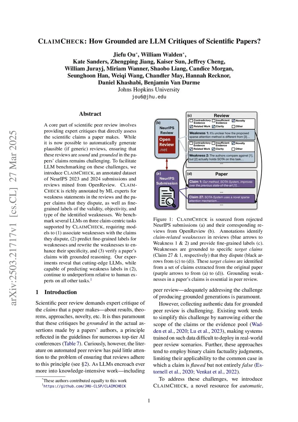 A core part of scientific peer review involves providing expert critiques that directly assess the scientific claims a paper makes. While it is now possible to automatically generate plausible (if generic) reviews, ensuring that these reviews are sound and grounded in the papers' claims remains challenging. To facilitate LLM benchmarking on these challenges, we introduce CLAIMCHECK, an annotated dataset of NeurIPS 2023 and 2024 submissions and reviews mined from OpenReview. CLAIMCHECK is richly annotated by ML experts for weakness statements in the reviews and the paper claims that they dispute, as well as fine-grained labels of the validity, objectivity, and type of the identified weaknesses. We benchmark several LLMs on three claim-centric tasks supported by CLAIMCHECK, requiring models to (1) associate weaknesses with the claims they dispute, (2) predict fine-grained labels for weaknesses and rewrite the weaknesses to enhance their specificity, and (3) verify a paper's claims with grounded reasoning. Our experiments reveal that cutting-edge LLMs, while capable of predicting weakness labels in (2), continue to underperform relative to human experts on all other tasks.
