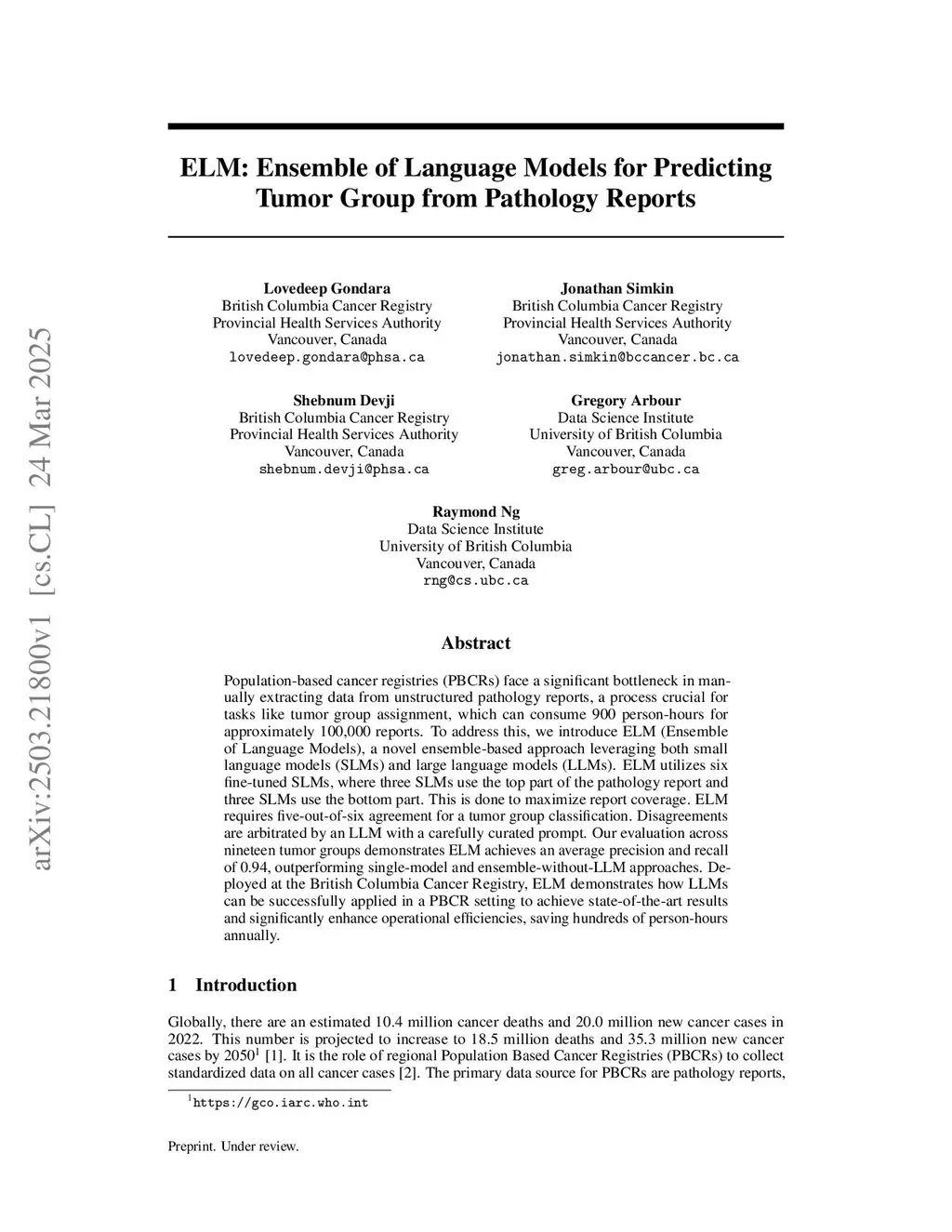Population-based cancer registries (PBCRs) face a significant bottleneck in manually extracting data from unstructured pathology reports, a process crucial for tasks like tumor group assignment, which can consume 900 person-hours for approximately 100,000 reports. To address this, we introduce ELM (Ensemble of Language Models), a novel ensemble-based approach leveraging both small language models (SLMs) and large language models (LLMs). ELM utilizes six fine-tuned SLMs, where three SLMs use the top part of the pathology report and three SLMs use the bottom part. This is done to maximize report coverage. ELM requires five-out-of-six agreement for a tumor group classification. Disagreements are arbitrated by an LLM with a carefully curated prompt. Our evaluation across nineteen tumor groups demonstrates ELM achieves an average precision and recall of 0.94, outperforming single-model and ensemble-without-LLM approaches. Deployed at the British Columbia Cancer Registry, ELM demonstrates how LLMs can be successfully applied in a PBCR setting to achieve state-of-the-art results and significantly enhance operational efficiencies, saving hundreds of person-hours annually.