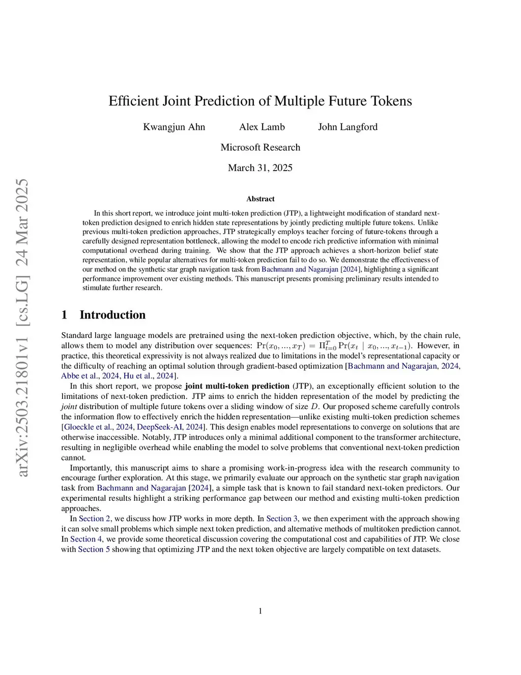 In this short report, we introduce joint multi-token prediction (JTP), a lightweight modification of standard next-token prediction designed to enrich hidden state representations by jointly predicting multiple future tokens. Unlike previous multi-token prediction approaches, JTP strategically employs teacher forcing of future-tokens through a carefully designed representation bottleneck, allowing the model to encode rich predictive information with minimal computational overhead during training. We show that the JTP approach achieves a short-horizon belief state representation, while popular alternatives for multi-token prediction fail to do so. We demonstrate the effectiveness of our method on the synthetic star graph navigation task from from Bachmann and Nagarajan [2024], highlighting a significant performance improvement over existing methods. This manuscript presents promising preliminary results intended to stimulate further research.