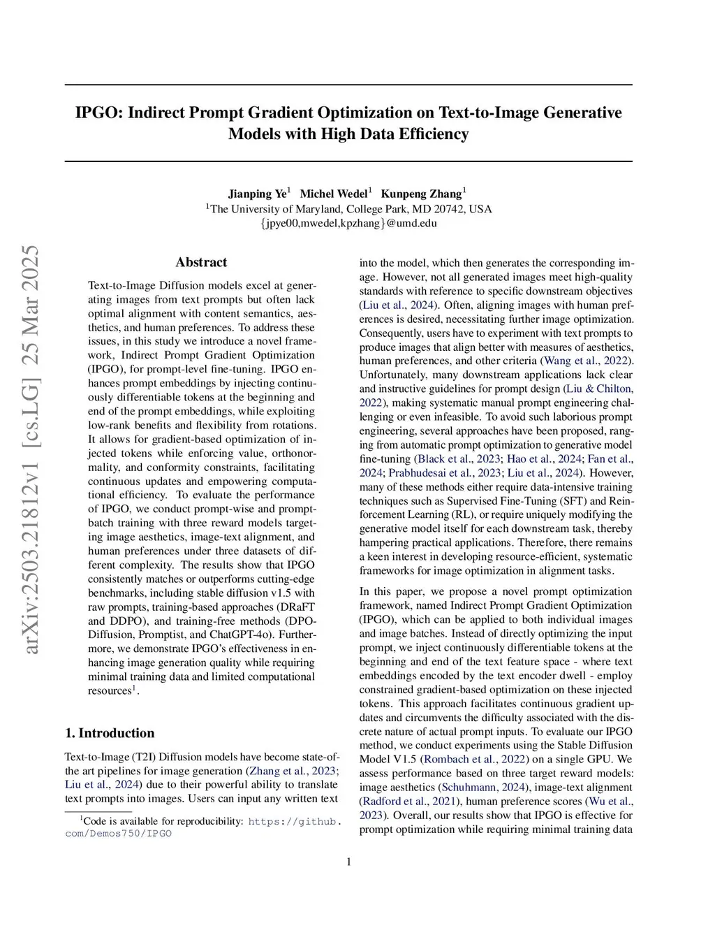 Text-to-Image Diffusion models excel at generating images from text prompts but often exhibit suboptimal alignment with content semantics, aesthetics, and human preferences. To address these limitations, this study proposes a novel parameter-efficient framework, Indirect Prompt Gradient Optimization (IPGO), for prompt-level diffusion model fine-tuning. IPGO enhances prompt embeddings by injecting continuously differentiable embeddings at the beginning and end of the prompt embeddings, leveraging low-rank structures with the flexibility and nonlinearity from rotations. This approach enables gradient-based optimization of injected embeddings under range, orthonormality, and conformity constraints, effectively narrowing the search space, promoting a stable solution, and ensuring alignment between the embeddings of the injected embeddings and the original prompt. Its extension IPGO+ adds a parameter-free cross-attention mechanism on the prompt embedding to enforce dependencies between the original prompt and the inserted embeddings. We conduct extensive evaluations through prompt-wise (IPGO) and prompt-batch (IPGO+) training using three reward models of image aesthetics, image-text alignment, and human preferences across three datasets of varying complexity. The results show that IPGO consistently outperforms SOTA benchmarks, including stable diffusion v1.5 with raw prompts, text-embedding-based methods (TextCraftor), training-based methods (DRaFT and DDPO), and training-free methods (DPO-Diffusion, Promptist, and ChatGPT-4o). Specifically, IPGO achieves a win-rate exceeding 99% in prompt-wise learning, and IPGO+ achieves a comparable, but often better performance against current SOTAs (a 75% win rate) in prompt-batch learning. Moreover, we illustrate IPGO's generalizability and its capability to significantly enhance image quality while requiring minimal data and resources.