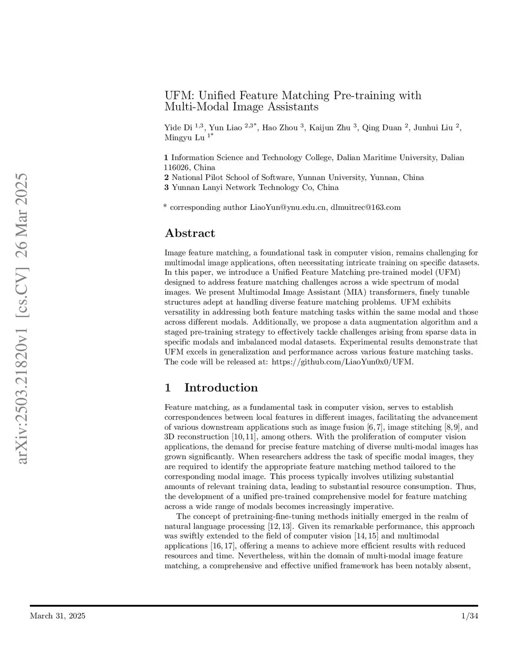 UFM: Unified Feature Matching Pre-training with Multi-Modal Image Assistants
