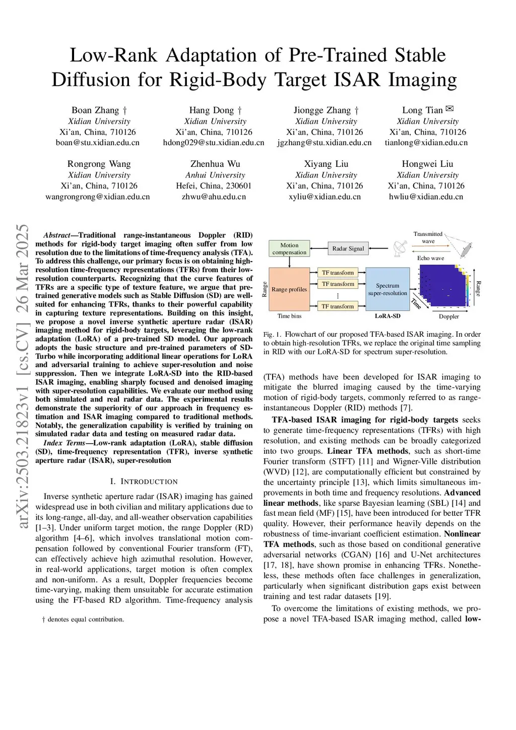 Traditional range-instantaneous Doppler (RID) methods for rigid-body target imaging often suffer from low resolution due to the limitations of time-frequency analysis (TFA). To address this challenge, our primary focus is on obtaining high resolution time-frequency representations (TFRs) from their low resolution counterparts. Recognizing that the curve features of TFRs are a specific type of texture feature, we argue that pre trained generative models such as Stable Diffusion (SD) are well suited for enhancing TFRs, thanks to their powerful capability in capturing texture representations. Building on this insight, we propose a novel inverse synthetic aperture radar (ISAR) imaging method for rigid-body targets, leveraging the low-rank adaptation (LoRA) of a pre-trained SD model. Our approach adopts the basic structure and pre-trained parameters of SD Turbo while incorporating additional linear operations for LoRA and adversarial training to achieve super-resolution and noise suppression. Then we integrate LoRA-SD into the RID-based ISAR imaging, enabling sharply focused and denoised imaging with super-resolution capabilities. We evaluate our method using both simulated and real radar data. The experimental results demonstrate the superiority of our approach in frequency es timation and ISAR imaging compared to traditional methods. Notably, the generalization capability is verified by training on simulated radar data and testing on measured radar data.