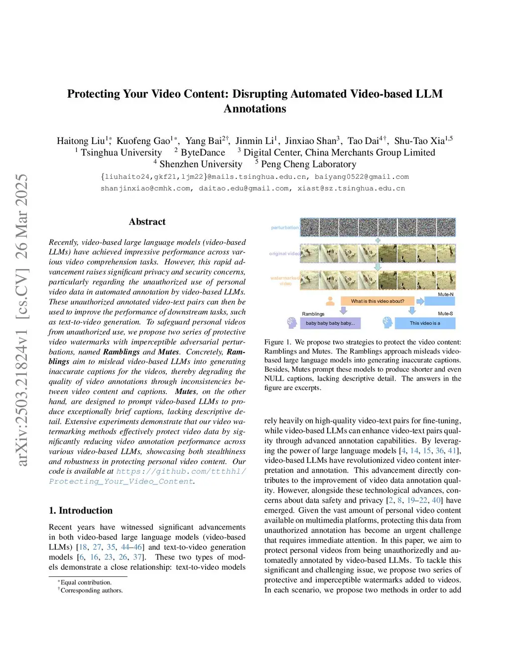 Recently, video-based large language models (video-based LLMs) have achieved impressive performance across various video comprehension tasks. However, this rapid advancement raises significant privacy and security concerns, particularly regarding the unauthorized use of personal video data in automated annotation by video-based LLMs. These unauthorized annotated video-text pairs can then be used to improve the performance of downstream tasks, such as text-to-video generation. To safeguard personal videos from unauthorized use, we propose two series of protective video watermarks with imperceptible adversarial perturbations, named Ramblings and Mutes. Concretely, Ramblings aim to mislead video-based LLMs into generating inaccurate captions for the videos, thereby degrading the quality of video annotations through inconsistencies between video content and captions. Mutes, on the other hand, are designed to prompt video-based LLMs to produce exceptionally brief captions, lacking descriptive detail. Extensive experiments demonstrate that our video watermarking methods effectively protect video data by significantly reducing video annotation performance across various video-based LLMs, showcasing both stealthiness and robustness in protecting personal video content. Our code is available atthis https URL.