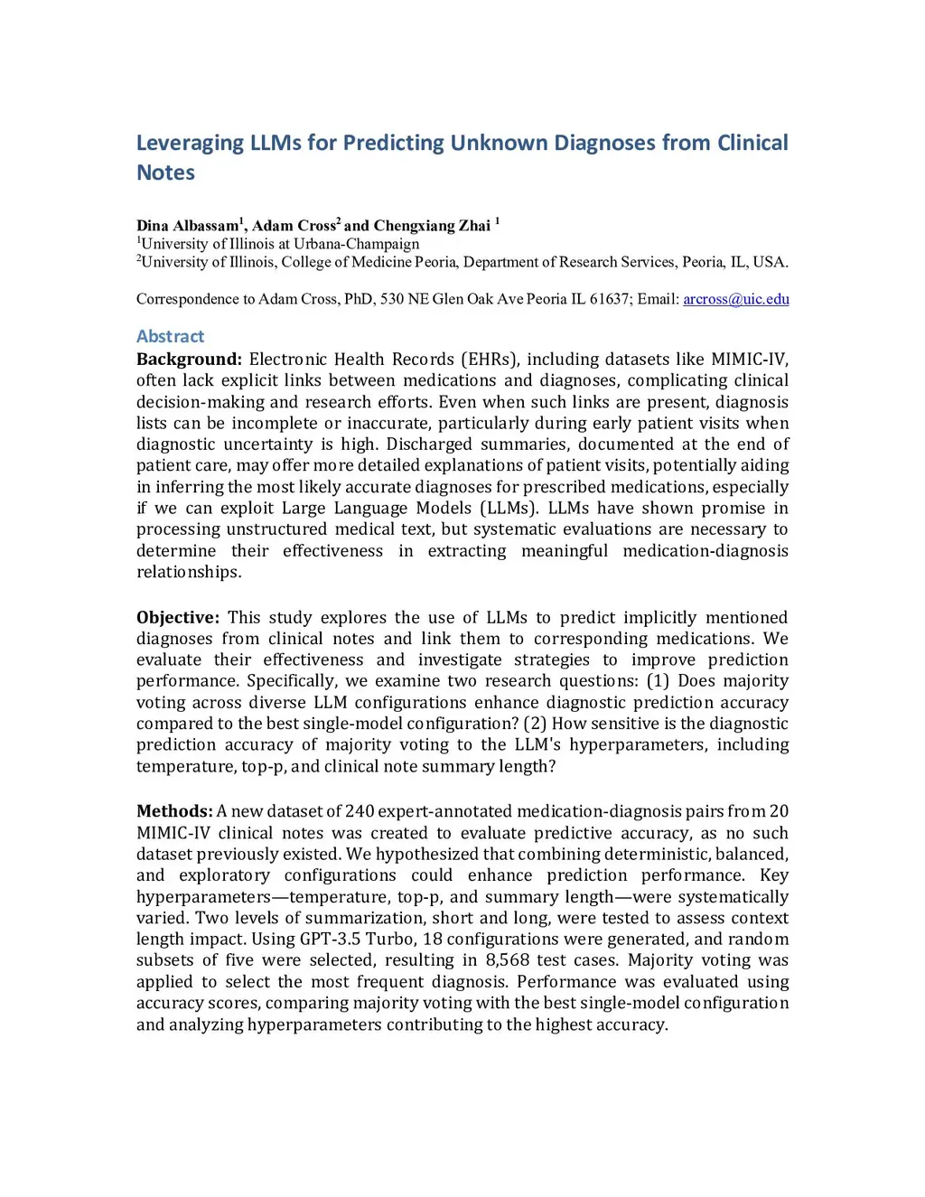 Electronic Health Records (EHRs) often lack explicit links between medications and diagnoses, making clinical decision-making and research more difficult. Even when links exist, diagnosis lists may be incomplete, especially during early patient visits. Discharge summaries tend to provide more complete information, which can help infer accurate diagnoses, especially with the help of large language models (LLMs). This study investigates whether LLMs can predict implicitly mentioned diagnoses from clinical notes and link them to corresponding medications. We address two research questions: (1) Does majority voting across diverse LLM configurations outperform the best single configuration in diagnosis prediction? (2) How sensitive is majority voting accuracy to LLM hyperparameters such as temperature, top-p, and summary length? To evaluate, we created a new dataset of 240 expert-annotated medication-diagnosis pairs from 20 MIMIC-IV notes. Using GPT-3.5 Turbo, we ran 18 prompting configurations across short and long summary lengths, generating 8568 test cases. Results show that majority voting achieved 75 percent accuracy, outperforming the best single configuration at 66 percent. No single hyperparameter setting dominated, but combining deterministic, balanced, and exploratory strategies improved performance. Shorter summaries generally led to higherthis http URLconclusion, ensemble-style majority voting with diverse LLM configurations improves diagnosis prediction in EHRs and offers a promising method to link medications and diagnoses in clinical texts.