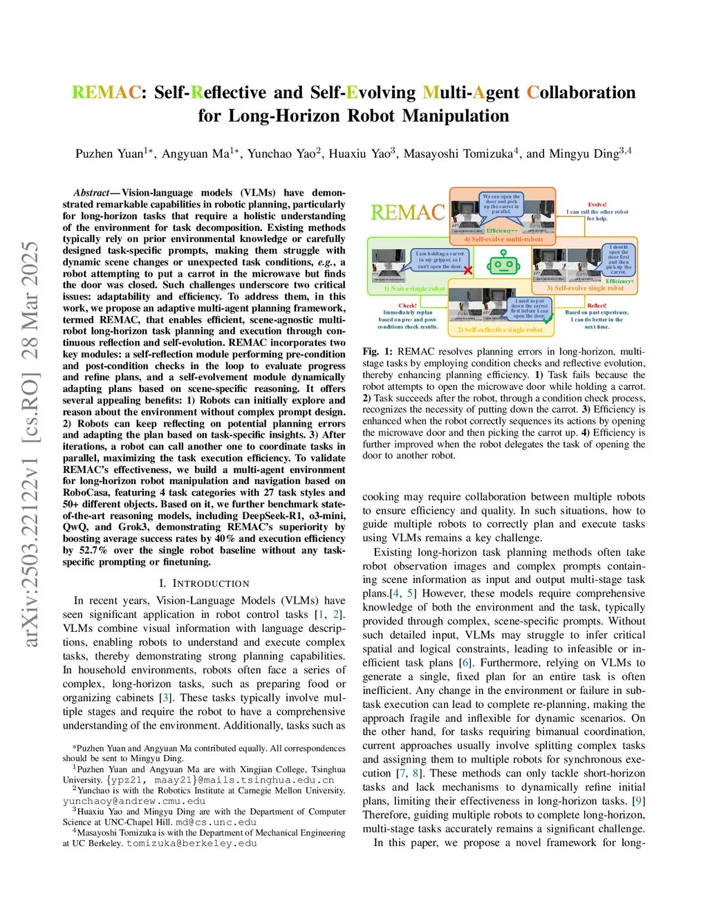 Vision-language models (VLMs) have demonstrated remarkable capabilities in robotic planning, particularly for long-horizon tasks that require a holistic understanding of the environment for task decomposition. Existing methods typically rely on prior environmental knowledge or carefully designed task-specific prompts, making them struggle with dynamic scene changes or unexpected task conditions, e.g., a robot attempting to put a carrot in the microwave but finds the door was closed. Such challenges underscore two critical issues: adaptability and efficiency. To address them, in this work, we propose an adaptive multi-agent planning framework, termed REMAC, that enables efficient, scene-agnostic multi-robot long-horizon task planning and execution through continuous reflection and self-evolution. REMAC incorporates two key modules: a self-reflection module performing pre-condition and post-condition checks in the loop to evaluate progress and refine plans, and a self-evolvement module dynamically adapting plans based on scene-specific reasoning. It offers several appealing benefits: 1) Robots can initially explore and reason about the environment without complex prompt design. 2) Robots can keep reflecting on potential planning errors and adapting the plan based on task-specific insights. 3) After iterations, a robot can call another one to coordinate tasks in parallel, maximizing the task execution efficiency. To validate REMAC's effectiveness, we build a multi-agent environment for long-horizon robot manipulation and navigation based on RoboCasa, featuring 4 task categories with 27 task styles and 50+ different objects. Based on it, we further benchmark state-of-the-art reasoning models, including DeepSeek-R1, o3-mini, QwQ, and Grok3, demonstrating REMAC's superiority by boosting average success rates by 40% and execution efficiency by 52.7% over the single robot baseline.