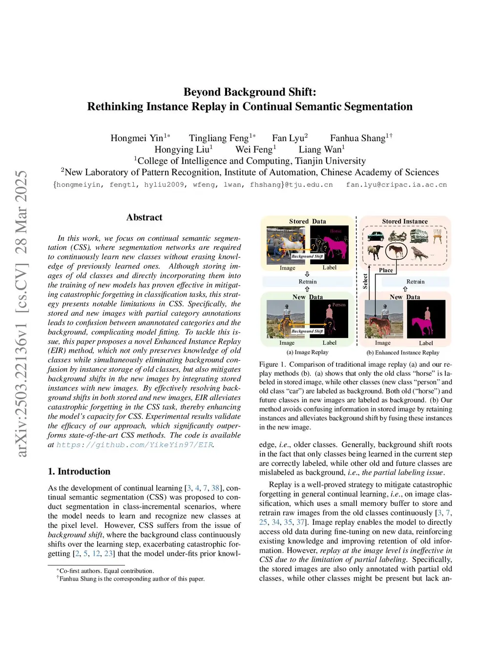 In this work, we focus on continual semantic segmentation (CSS), where segmentation networks are required to continuously learn new classes without erasing knowledge of previously learned ones. Although storing images of old classes and directly incorporating them into the training of new models has proven effective in mitigating catastrophic forgetting in classification tasks, this strategy presents notable limitations in CSS. Specifically, the stored and new images with partial category annotations leads to confusion between unannotated categories and the background, complicating model fitting. To tackle this issue, this paper proposes a novel Enhanced Instance Replay (EIR) method, which not only preserves knowledge of old classes while simultaneously eliminating background confusion by instance storage of old classes, but also mitigates background shifts in the new images by integrating stored instances with new images. By effectively resolving background shifts in both stored and new images, EIR alleviates catastrophic forgetting in the CSS task, thereby enhancing the model's capacity for CSS. Experimental results validate the efficacy of our approach, which significantly outperforms state-of-the-art CSS methods.