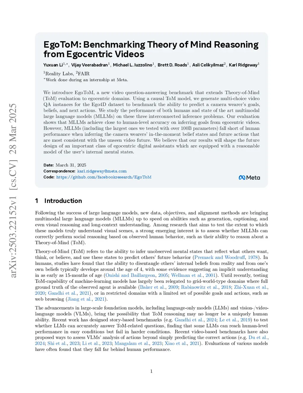 EgoToM: Benchmarking Theory of Mind Reasoning from Egocentric Videos