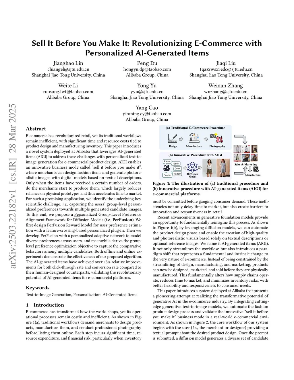 E-commerce has revolutionized retail, yet its traditional workflows remain inefficient, with significant resource costs tied to product design and inventory. This paper introduces a novel system deployed at Alibaba that uses AI-generated items (AIGI) to address these challenges with personalized text-to-image generation for e-commerce product design. AIGI enables an innovative business mode called "sell it before you make it", where merchants can design fashion items and generate photorealistic images with digital models based on textual descriptions. Only when the items have received a certain number of orders, do the merchants start to produce them, which largely reduces reliance on physical prototypes and thus accelerates time to market. For such a promising application, we identify the underlying key scientific challenge, i.e., capturing users' group-level personalized preferences towards multiple generated images. To this end, we propose a Personalized Group-Level Preference Alignment Framework for Diffusion Models (PerFusion). We first design PerFusion Reward Model for user preference estimation with a feature-crossing-based personalized plug-in. Then we develop PerFusion with a personalized adaptive network to model diverse preferences across users, and meanwhile derive the group-level preference optimization objective to model comparative behaviors among multiple images. Both offline and online experiments demonstrate the effectiveness of our proposed algorithm. The AI-generated items achieve over 13% relative improvements for both click-through rate and conversion rate, as well as 7.9% decrease in return rate, compared to their human-designed counterparts, validating the transformative potential of AIGI for e-commerce platforms.