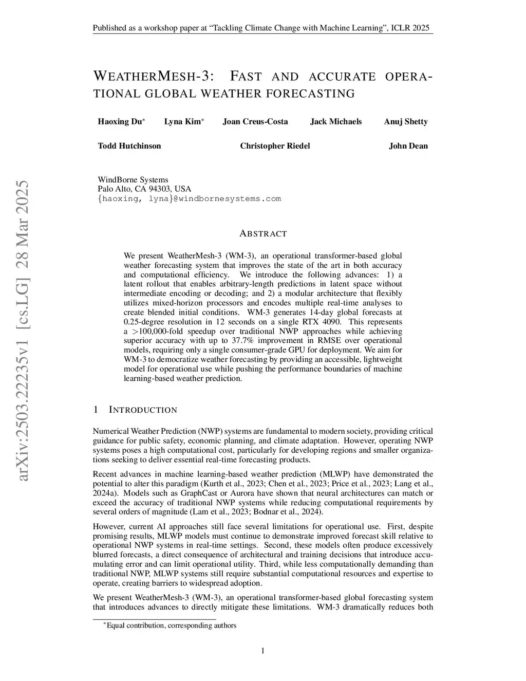 We present WeatherMesh-3 (WM-3), an operational transformer-based global weather forecasting system that improves the state of the art in both accuracy and computational efficiency. We introduce the following advances: 1) a latent rollout that enables arbitrary-length predictions in latent space without intermediate encoding or decoding; and 2) a modular architecture that flexibly utilizes mixed-horizon processors and encodes multiple real-time analyses to create blended initial conditions. WM-3 generates 14-day global forecasts at 0.25-degree resolution in 12 seconds on a single RTX 4090. This represents a >100,000-fold speedup over traditional NWP approaches while achieving superior accuracy with up to 37.7% improvement in RMSE over operational models, requiring only a single consumer-grade GPU for deployment. We aim for WM-3 to democratize weather forecasting by providing an accessible, lightweight model for operational use while pushing the performance boundaries of machine learning-based weather prediction.