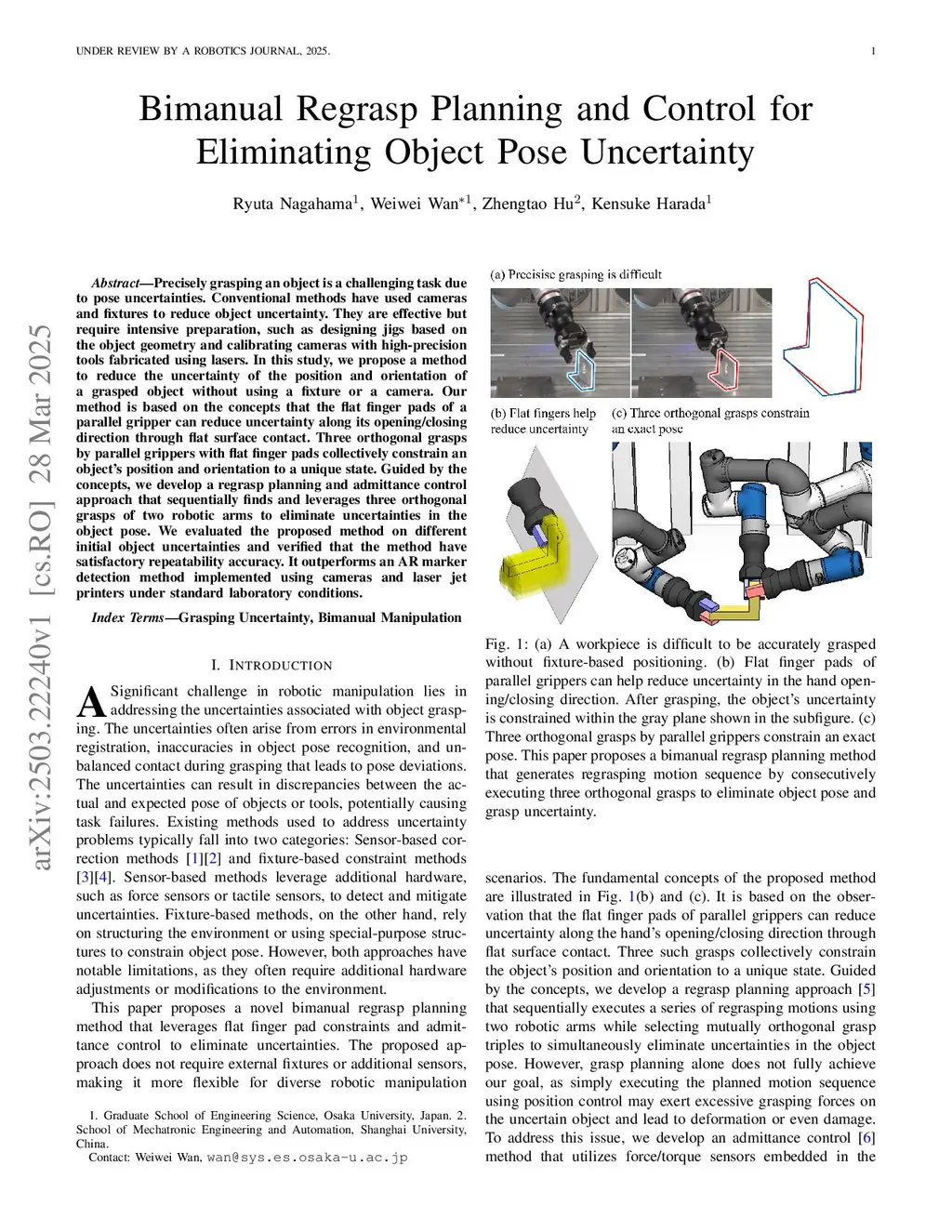 Precisely grasping an object is a challenging task due to pose uncertainties. Conventional methods have used cameras and fixtures to reduce object uncertainty. They are effective but require intensive preparation, such as designing jigs based on the object geometry and calibrating cameras with high-precision tools fabricated using lasers. In this study, we propose a method to reduce the uncertainty of the position and orientation of a grasped object without using a fixture or a camera. Our method is based on the concept that the flat finger pads of a parallel gripper can reduce uncertainty along its opening/closing direction through flat surface contact. Three orthogonal grasps by parallel grippers with flat finger pads collectively constrain an object's position and orientation to a unique state. Guided by the concepts, we develop a regrasp planning and admittance control approach that sequentially finds and leverages three orthogonal grasps of two robotic arms to actively reduce uncertainties in the object pose. We evaluated the proposed method on different initial object uncertainties and verified that it had good repeatability. The deviation levels of the experimental trials were on the same order of magnitude as those of an optical tracking system, demonstrating strong relative inference performance.