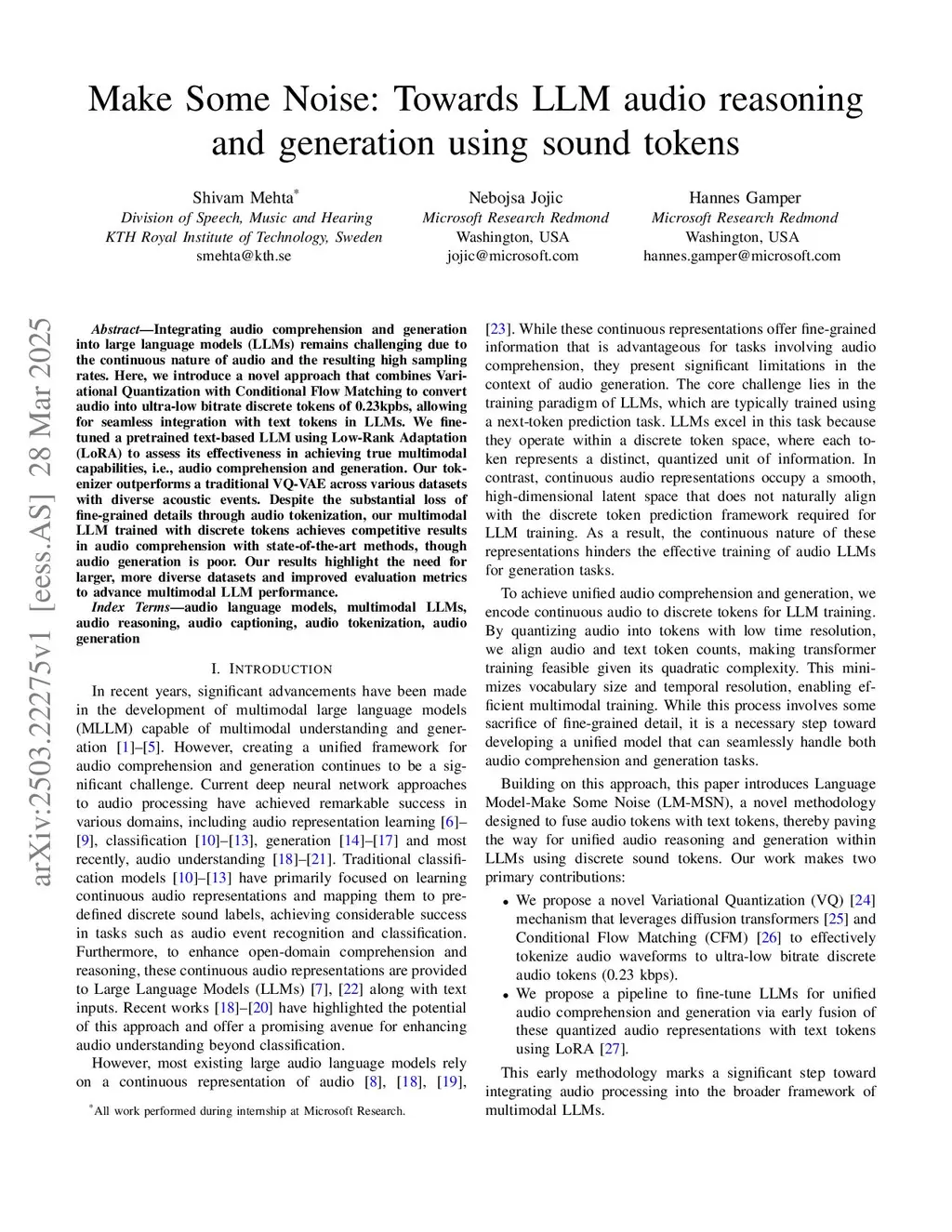 Make Some Noise: Towards LLM audio reasoning and generation using sound tokens