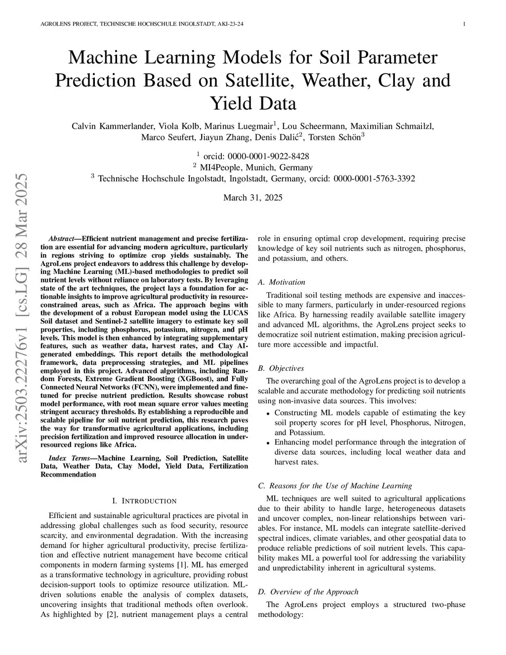Efficient nutrient management and precise fertilization are essential for advancing modern agriculture, particularly in regions striving to optimize crop yields sustainably. The AgroLens project endeavors to address this challenge by develop ing Machine Learning (ML)-based methodologies to predict soil nutrient levels without reliance on laboratory tests. By leveraging state of the art techniques, the project lays a foundation for acionable insights to improve agricultural productivity in resource-constrained areas, such as Africa. The approach begins with the development of a robust European model using the LUCAS Soil dataset and Sentinel-2 satellite imagery to estimate key soil properties, including phosphorus, potassium, nitrogen, and pH levels. This model is then enhanced by integrating supplementary features, such as weather data, harvest rates, and Clay AI-generated embeddings. This report details the methodological framework, data preprocessing strategies, and ML pipelines employed in this project. Advanced algorithms, including Random Forests, Extreme Gradient Boosting (XGBoost), and Fully Connected Neural Networks (FCNN), were implemented and finetuned for precise nutrient prediction. Results showcase robust model performance, with root mean square error values meeting stringent accuracy thresholds. By establishing a reproducible and scalable pipeline for soil nutrient prediction, this research paves the way for transformative agricultural applications, including precision fertilization and improved resource allocation in underresourced regions like Africa.