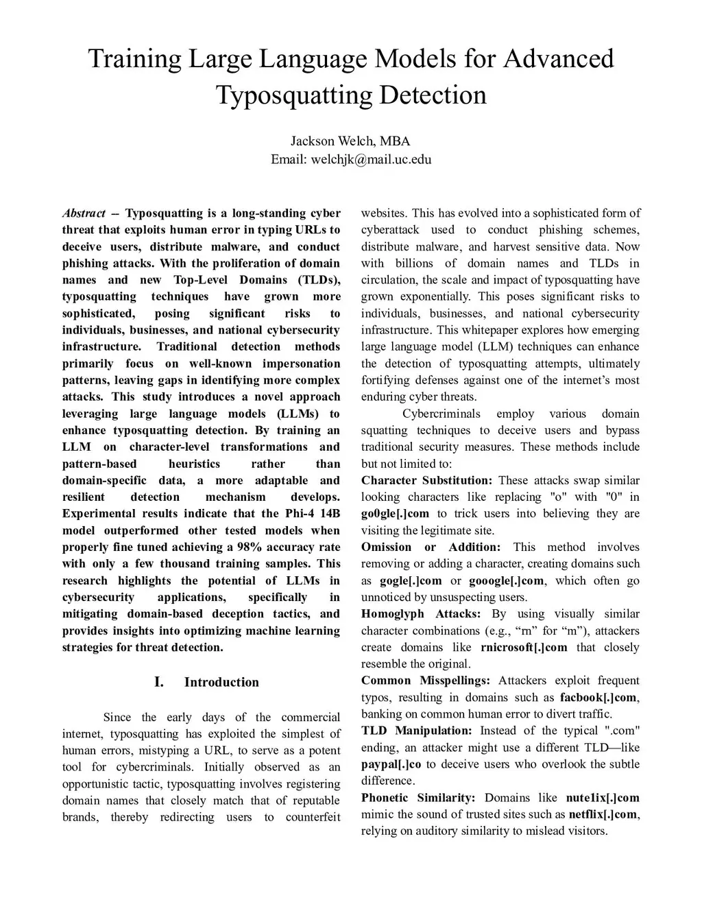 Typosquatting is a long-standing cyber threat that exploits human error in typing URLs to deceive users, distribute malware, and conduct phishing attacks. With the proliferation of domain names and new Top-Level Domains (TLDs), typosquatting techniques have grown more sophisticated, posing significant risks to individuals, businesses, and national cybersecurity infrastructure. Traditional detection methods primarily focus on well-known impersonation patterns, leaving gaps in identifying more complex attacks. This study introduces a novel approach leveraging large language models (LLMs) to enhance typosquatting detection. By training an LLM on character-level transformations and pattern-based heuristics rather than domain-specific data, a more adaptable and resilient detection mechanism develops. Experimental results indicate that the Phi-4 14B model outperformed other tested models when properly fine tuned achieving a 98% accuracy rate with only a few thousand training samples. This research highlights the potential of LLMs in cybersecurity applications, specifically in mitigating domain-based deception tactics, and provides insights into optimizing machine learning strategies for threat detection.