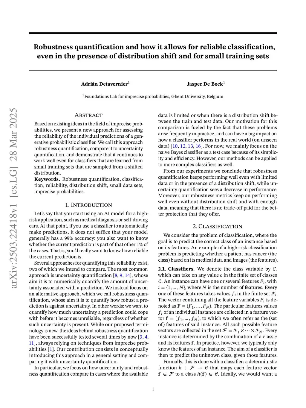 Based on existing ideas in the field of imprecise probabilities, we present a new approach for assessing the reliability of the individual predictions of a generative probabilistic classifier. We call this approach robustness quantification, compare it to uncertainty quantification, and demonstrate that it continues to work well even for classifiers that are learned from small training sets that are sampled from a shifted distribution.