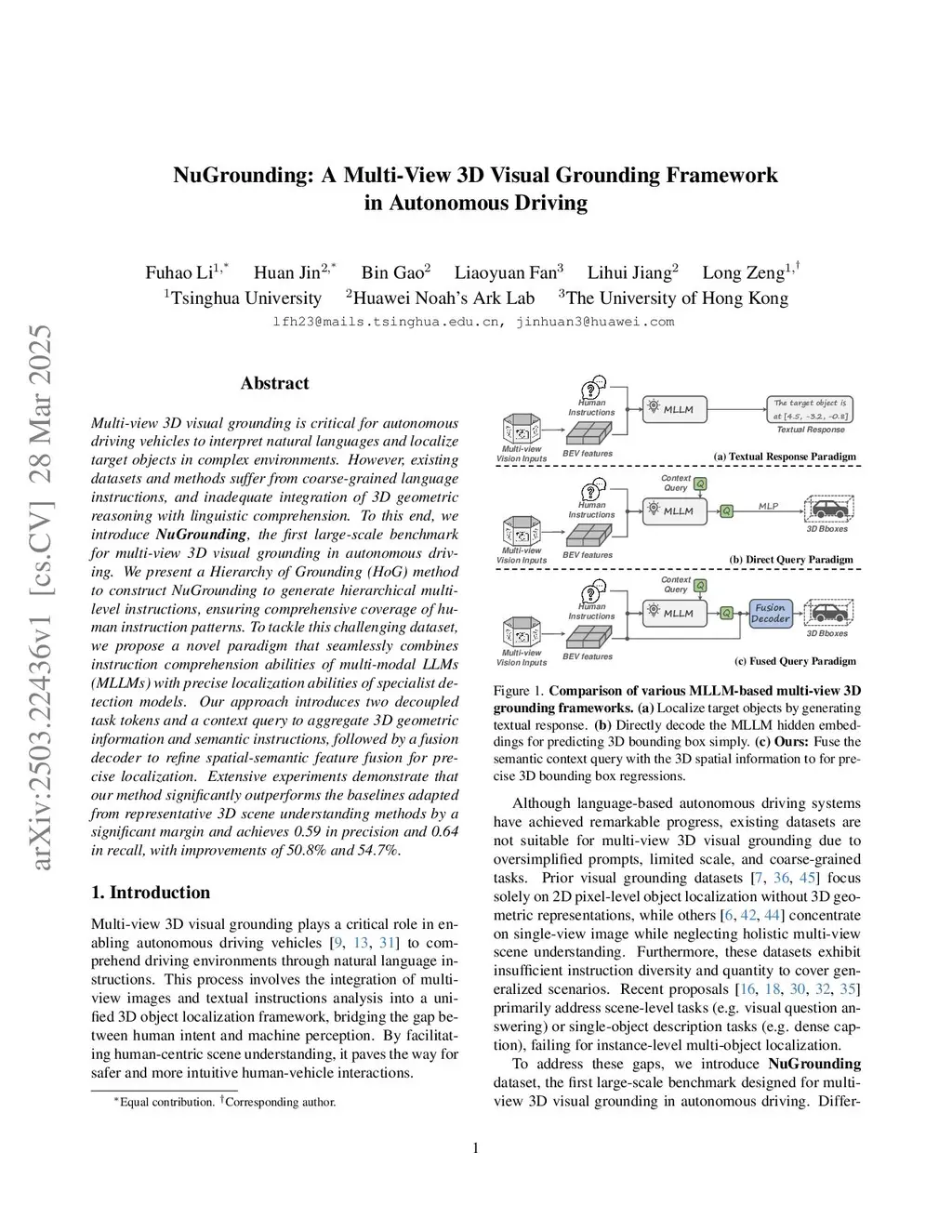 Multi-view 3D visual grounding is critical for autonomous driving vehicles to interpret natural languages and localize target objects in complex environments. However, existing datasets and methods suffer from coarse-grained language instructions, and inadequate integration of 3D geometric reasoning with linguistic comprehension. To this end, we introduce NuGrounding, the first large-scale benchmark for multi-view 3D visual grounding in autonomous driving. We present a Hierarchy of Grounding (HoG) method to construct NuGrounding to generate hierarchical multi-level instructions, ensuring comprehensive coverage of human instruction patterns. To tackle this challenging dataset, we propose a novel paradigm that seamlessly combines instruction comprehension abilities of multi-modal LLMs (MLLMs) with precise localization abilities of specialist detection models. Our approach introduces two decoupled task tokens and a context query to aggregate 3D geometric information and semantic instructions, followed by a fusion decoder to refine spatial-semantic feature fusion for precise localization. Extensive experiments demonstrate that our method significantly outperforms the baselines adapted from representative 3D scene understanding methods by a significant margin and achieves 0.59 in precision and 0.64 in recall, with improvements of 50.8% and 54.7%.