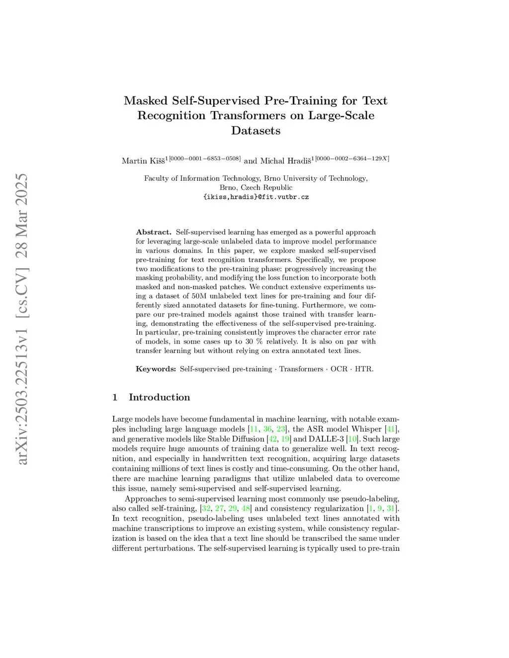 Masked Self-Supervised Pre-Training for Text Recognition Transformers on Large-Scale Datasets