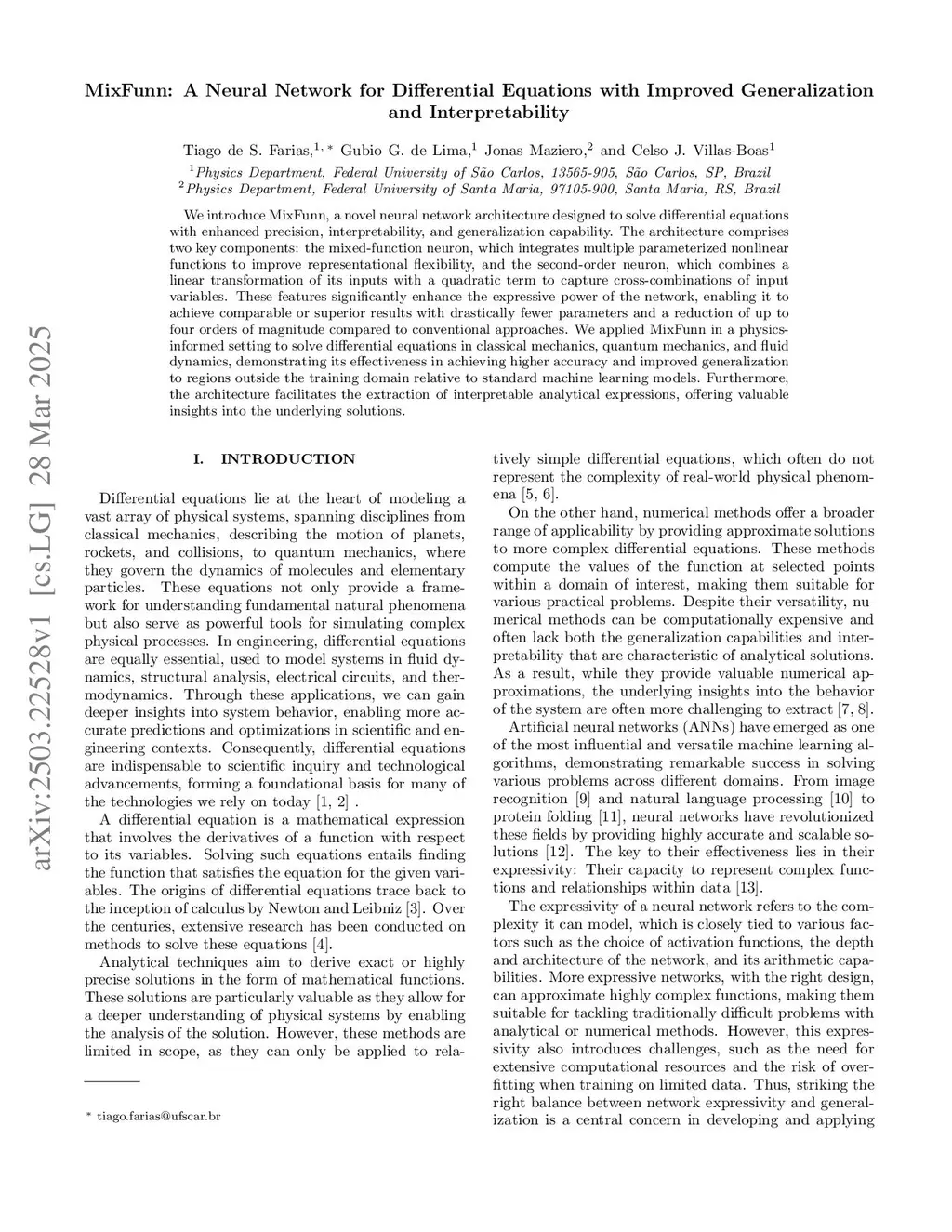 We introduce MixFunn, a novel neural network architecture designed to solve differential equations with enhanced precision, interpretability, and generalization capability. The architecture comprises two key components: the mixed-function neuron, which integrates multiple parameterized nonlinear functions to improve representational flexibility, and the second-order neuron, which combines a linear transformation of its inputs with a quadratic term to capture cross-combinations of input variables. These features significantly enhance the expressive power of the network, enabling it to achieve comparable or superior results with drastically fewer parameters and a reduction of up to four orders of magnitude compared to conventional approaches. We applied MixFunn in a physics-informed setting to solve differential equations in classical mechanics, quantum mechanics, and fluid dynamics, demonstrating its effectiveness in achieving higher accuracy and improved generalization to regions outside the training domain relative to standard machine learning models. Furthermore, the architecture facilitates the extraction of interpretable analytical expressions, offering valuable insights into the underlying solutions.