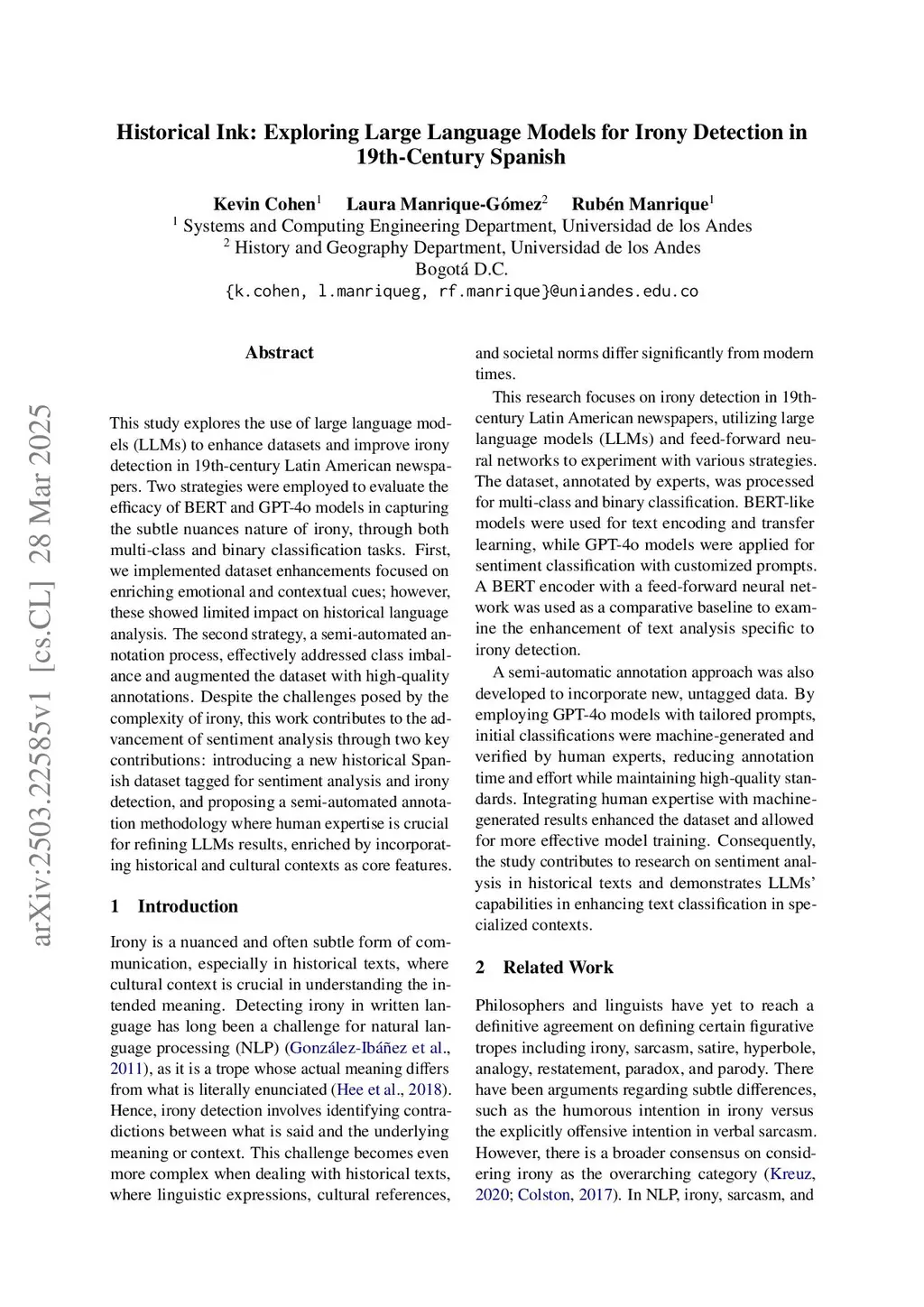 This study explores the use of large language models (LLMs) to enhance datasets and improve irony detection in 19th-century Latin American newspapers. Two strategies were employed to evaluate the efficacy of BERT and GPT-4o models in capturing the subtle nuances nature of irony, through both multi-class and binary classification tasks. First, we implemented dataset enhancements focused on enriching emotional and contextual cues; however, these showed limited impact on historical language analysis. The second strategy, a semi-automated annotation process, effectively addressed class imbalance and augmented the dataset with high-quality annotations. Despite the challenges posed by the complexity of irony, this work contributes to the advancement of sentiment analysis through two key contributions: introducing a new historical Spanish dataset tagged for sentiment analysis and irony detection, and proposing a semi-automated annotation methodology where human expertise is crucial for refining LLMs results, enriched by incorporating historical and cultural contexts as core features.