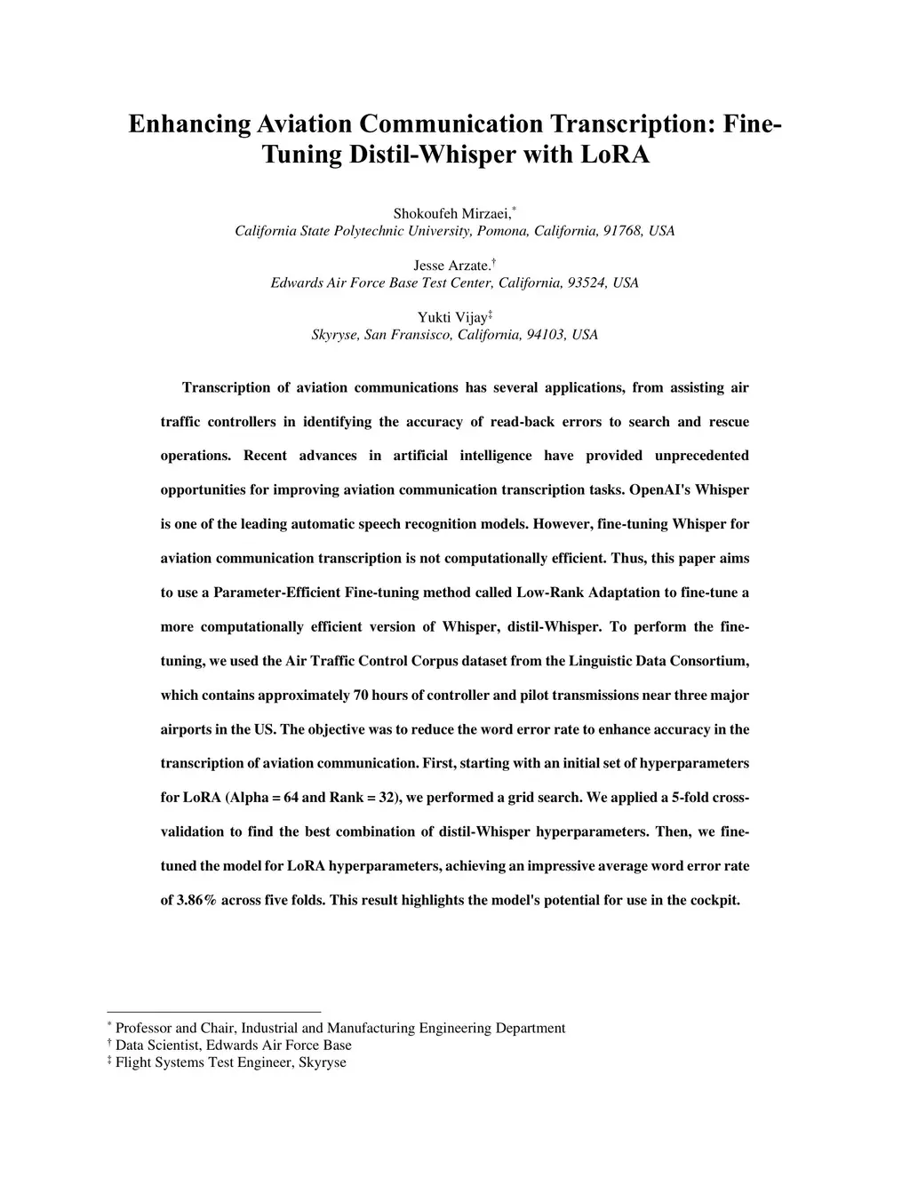 Transcription of aviation communications has several applications, from assisting air traffic controllers in identifying the accuracy of read-back errors to search and rescue operations. Recent advances in artificial intelligence have provided unprecedented opportunities for improving aviation communication transcription tasks. OpenAI's Whisper is one of the leading automatic speech recognition models. However, fine-tuning Whisper for aviation communication transcription is not computationally efficient. Thus, this paper aims to use a Parameter-Efficient Fine-tuning method called Low-Rank Adaptation to fine-tune a more computationally efficient version of Whisper, distil-Whisper. To perform the fine-tuning, we used the Air Traffic Control Corpus dataset from the Linguistic Data Consortium, which contains approximately 70 hours of controller and pilot transmissions near three major airports in the US. The objective was to reduce the word error rate to enhance accuracy in the transcription of aviation communication. First, starting with an initial set of hyperparameters for LoRA (Alpha = 64 and Rank = 32), we performed a grid search. We applied a 5-fold cross-validation to find the best combination of distil-Whisper hyperparameters. Then, we fine-tuned the model for LoRA hyperparameters, achieving an impressive average word error rate of 3.86% across five folds. This result highlights the model's potential for use in the cockpit.