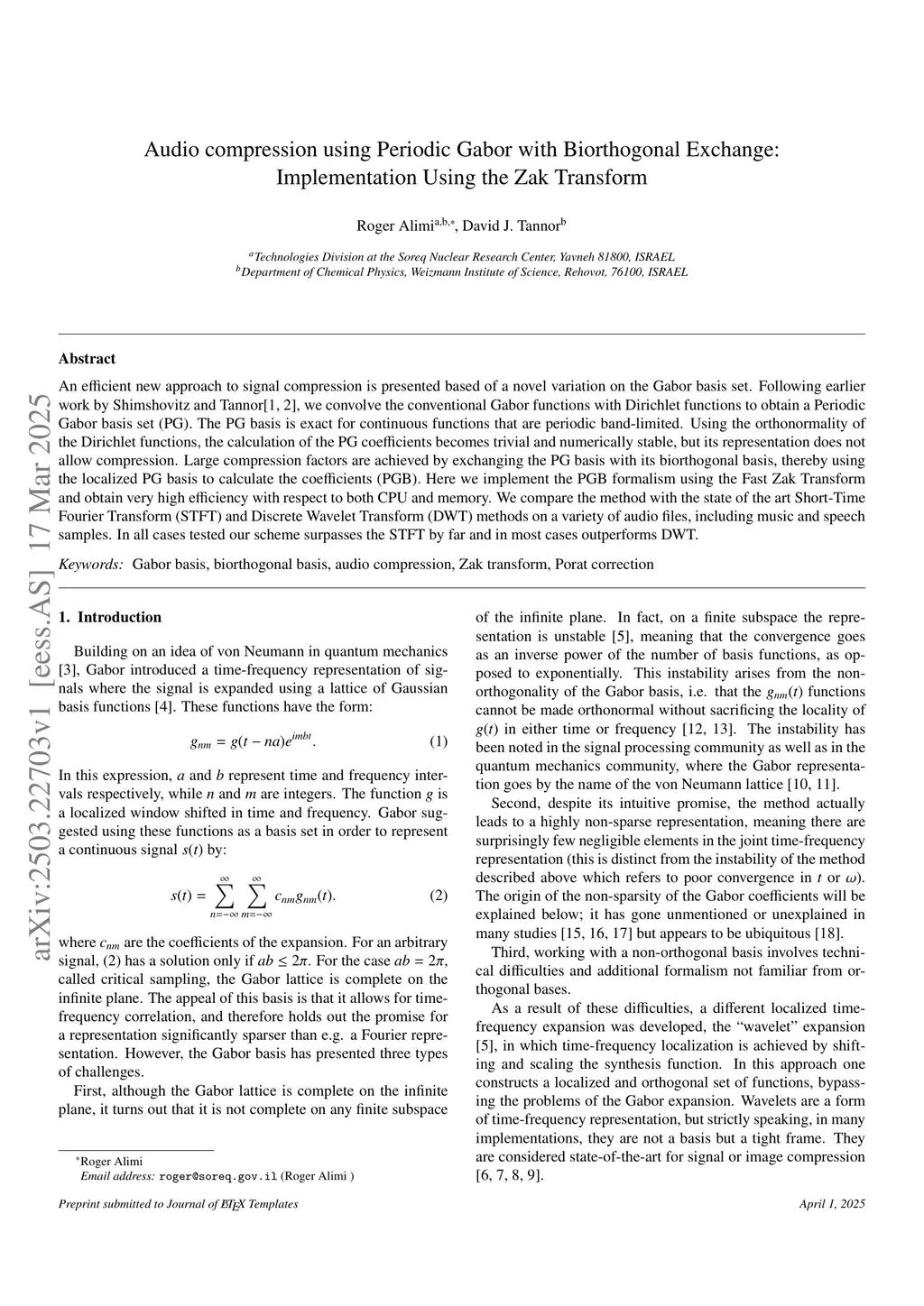 An efficient new approach to signal compression is presented based of a novel variation on the Gabor basis set. Following earlier work by Shimshovitz and Tannor, we convolve the conventional Gabor functions with Dirichlet functions to obtain a Periodic Gabor basis set (PG). The PG basis is exact for continuous functions that are periodic band-limited. Using the orthonormality of the Dirichlet functions, the calculation of the PG coefficients becomes trivial and numerically stable, but its representation does not allow compression. Large compression factors are achieved by exchanging the PG basis with its biorthogonal basis, thereby using the localized PG basis to calculate the coefficients (PGB). Here we implement the PGB formalism using the Fast Zak Transform and obtain very high efficiency with respect to both CPU and memory. We compare the method with the state of the art Short-Time Fourier Transform (STFT) and Discrete Wavelet Transform (DWT) methods on a variety of audio files, including music and speech samples. In all cases tested our scheme surpasses the STFT by far and in most cases outperforms DWT.