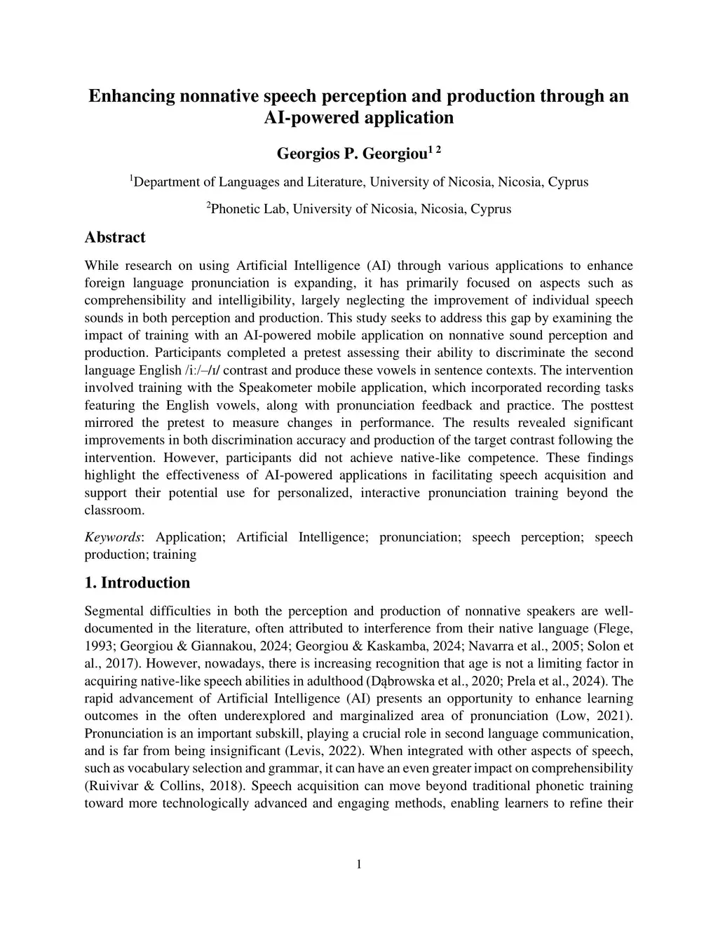 While research on using Artificial Intelligence (AI) through various applications to enhance foreign language pronunciation is expanding, it has primarily focused on aspects such as comprehensibility and intelligibility, largely neglecting the improvement of individual speech sounds in both perception and production. This study seeks to address this gap by examining the impact of training with an AI-powered mobile application on nonnative sound perception and production. Participants completed a pretest assessing their ability to discriminate the second language English heed-hid contrast and produce these vowels in sentence contexts. The intervention involved training with the Speakometer mobile application, which incorporated recording tasks featuring the English vowels, along with pronunciation feedback and practice. The posttest mirrored the pretest to measure changes in performance. The results revealed significant improvements in both discrimination accuracy and production of the target contrast following the intervention. However, participants did not achieve native-like competence. These findings highlight the effectiveness of AI-powered applications in facilitating speech acquisition and support their potential use for personalized, interactive pronunciation training beyond the classroom.