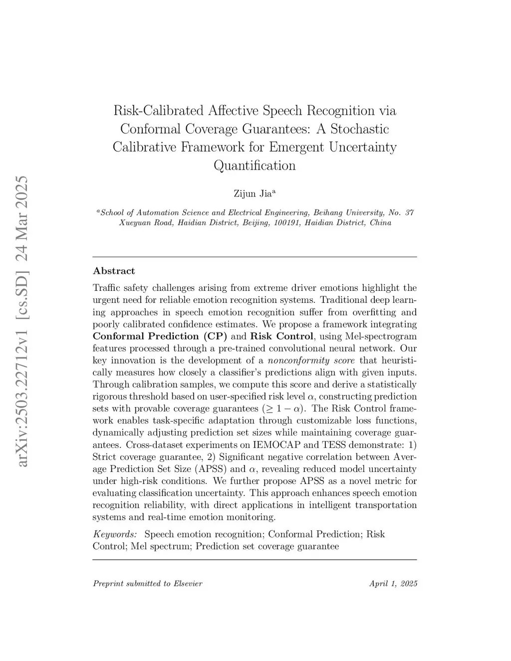 Road rage, often triggered by emotional suppression and sudden outbursts, significantly threatens road safety by causing collisions and aggressive behavior. Speech emotion recognition technologies can mitigate this risk by identifying negative emotions early and issuing timely alerts. However, current SER methods, such as those based on hidden markov models and Long short-term memory networks, primarily handle one-dimensional signals, frequently experience overfitting, and lack calibration, limiting their safety-critical effectiveness. We propose a novel risk-controlled prediction framework providing statistically rigorous guarantees on prediction accuracy. This approach employs a calibration set to define a binary loss function indicating whether the true label is included in the prediction set. Using a data-driven threshold , we optimize a joint loss function to maintain an expected test loss bounded by a user-specified risk level . Evaluations across six baseline models and two benchmark datasets demonstrate our framework consistently achieves a minimum coverage of , effectively controlling marginal error rates despite varying calibration-test split ratios (e.g., 0.1). The robustness and generalizability of the framework are further validated through an extension to small-batch online calibration under a local exchangeability assumption. We construct a non-negative test martingale to maintain prediction validity even in dynamic and non-exchangeable environments. Cross-dataset tests confirm our method's ability to uphold reliable statistical guarantees in realistic, evolving data scenarios.