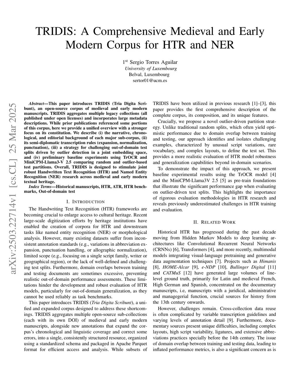 This paper introduces TRIDIS (Tria Digita Scribunt), an open-source corpus of medieval and early modern manuscripts. TRIDIS aggregates multiple legacy collections (all published under open licenses) and incorporates large metadata descriptions. While prior publications referenced some portions of this corpus, here we provide a unified overview with a stronger focus on its constitution. We describe (i) the narrative, chronological, and editorial background of each major sub-corpus, (ii) its semi-diplomatic transcription rules (expansion, normalization, punctuation), (iii) a strategy for challenging out-of-domain test splits driven by outlier detection in a joint embedding space, and (iv) preliminary baseline experiments using TrOCR and MiniCPM2.5 comparing random and outlier-based test partitions. Overall, TRIDIS is designed to stimulate joint robust Handwritten Text Recognition (HTR) and Named Entity Recognition (NER) research across medieval and early modern textual heritage.