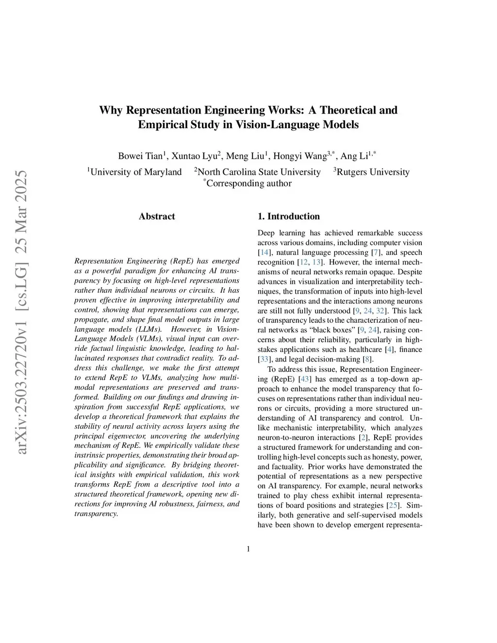 Representation Engineering (RepE) has emerged as a powerful paradigm for enhancing AI transparency by focusing on high-level representations rather than individual neurons or circuits. It has proven effective in improving interpretability and control, showing that representations can emerge, propagate, and shape final model outputs in large language models (LLMs). However, in Vision-Language Models (VLMs), visual input can override factual linguistic knowledge, leading to hallucinated responses that contradict reality. To address this challenge, we make the first attempt to extend RepE to VLMs, analyzing how multimodal representations are preserved and transformed. Building on our findings and drawing inspiration from successful RepE applications, we develop a theoretical framework that explains the stability of neural activity across layers using the principal eigenvector, uncovering the underlying mechanism of RepE. We empirically validate these instrinsic properties, demonstrating their broad applicability and significance. By bridging theoretical insights with empirical validation, this work transforms RepE from a descriptive tool into a structured theoretical framework, opening new directions for improving AI robustness, fairness, and transparency.
