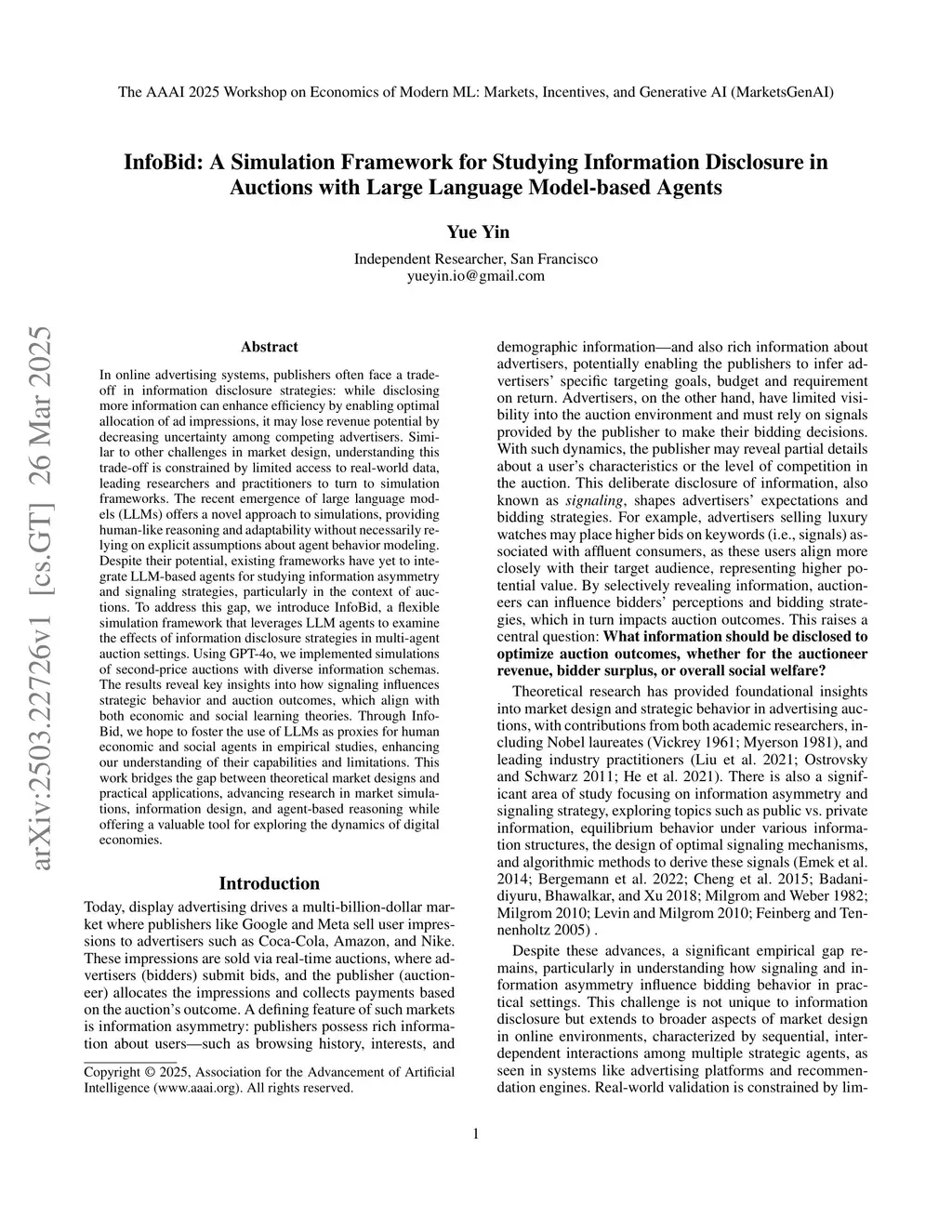 In online advertising systems, publishers often face a trade-off in information disclosure strategies: while disclosing more information can enhance efficiency by enabling optimal allocation of ad impressions, it may lose revenue potential by decreasing uncertainty among competing advertisers. Similar to other challenges in market design, understanding this trade-off is constrained by limited access to real-world data, leading researchers and practitioners to turn to simulation frameworks. The recent emergence of large language models (LLMs) offers a novel approach to simulations, providing human-like reasoning and adaptability without necessarily relying on explicit assumptions about agent behavior modeling. Despite their potential, existing frameworks have yet to integrate LLM-based agents for studying information asymmetry and signaling strategies, particularly in the context of auctions. To address this gap, we introduce InfoBid, a flexible simulation framework that leverages LLM agents to examine the effects of information disclosure strategies in multi-agent auction settings. Using GPT-4o, we implemented simulations of second-price auctions with diverse information schemas. The results reveal key insights into how signaling influences strategic behavior and auction outcomes, which align with both economic and social learning theories. Through InfoBid, we hope to foster the use of LLMs as proxies for human economic and social agents in empirical studies, enhancing our understanding of their capabilities and limitations. This work bridges the gap between theoretical market designs and practical applications, advancing research in market simulations, information design, and agent-based reasoning while offering a valuable tool for exploring the dynamics of digital economies.