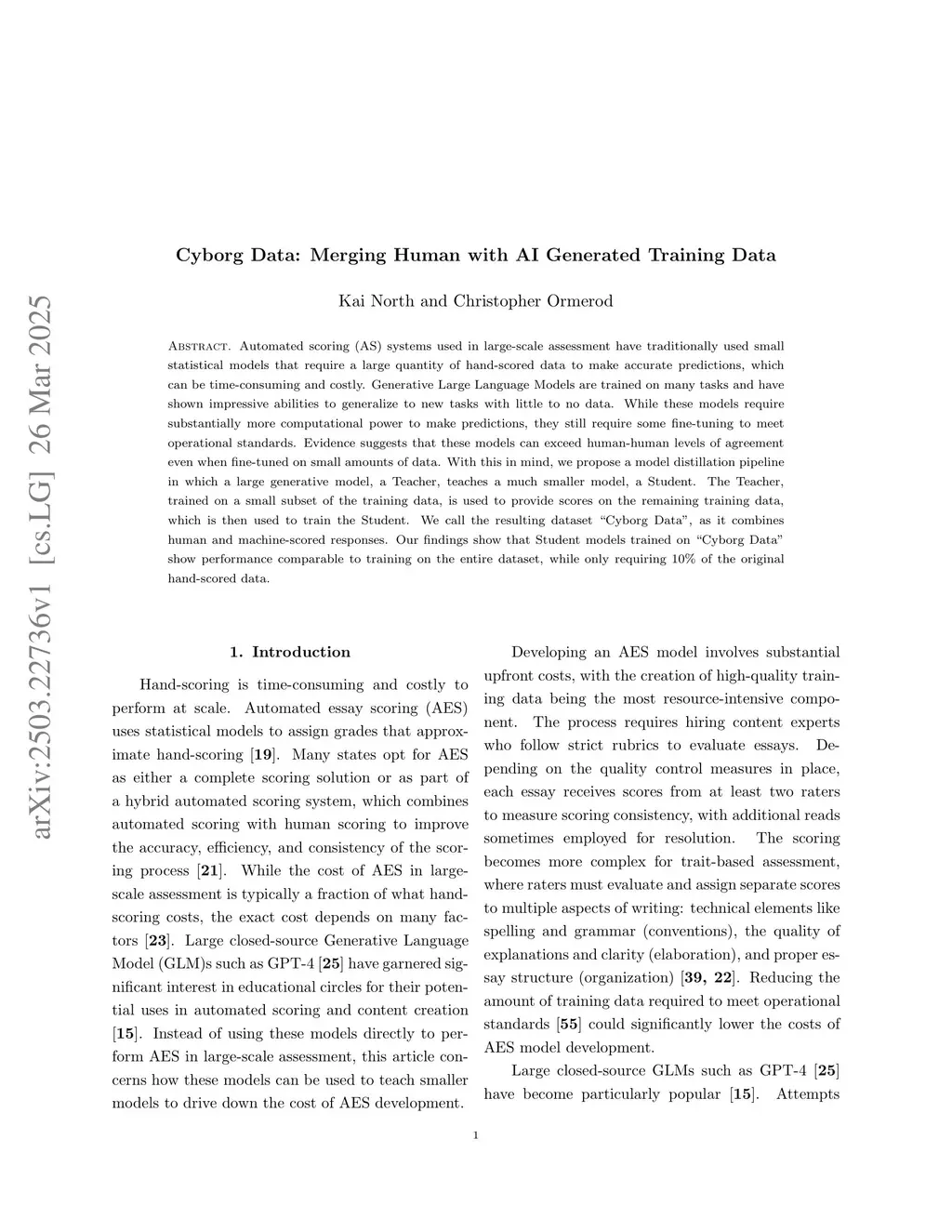 Automated scoring (AS) systems used in large-scale assessment have traditionally used small statistical models that require a large quantity of hand-scored data to make accurate predictions, which can be time-consuming and costly. Generative Large Language Models are trained on many tasks and have shown impressive abilities to generalize to new tasks with little to no data. While these models require substantially more computational power to make predictions, they still require some fine-tuning to meet operational standards. Evidence suggests that these models can exceed human-human levels of agreement even when fine-tuned on small amounts of data. With this in mind, we propose a model distillation pipeline in which a large generative model, a Teacher, teaches a much smaller model, a Student. The Teacher, trained on a small subset of the training data, is used to provide scores on the remaining training data, which is then used to train the Student. We call the resulting dataset "Cyborg Data", as it combines human and machine-scored responses. Our findings show that Student models trained on "Cyborg Data" show performance comparable to training on the entire dataset, while only requiring 10% of the original hand-scored data.