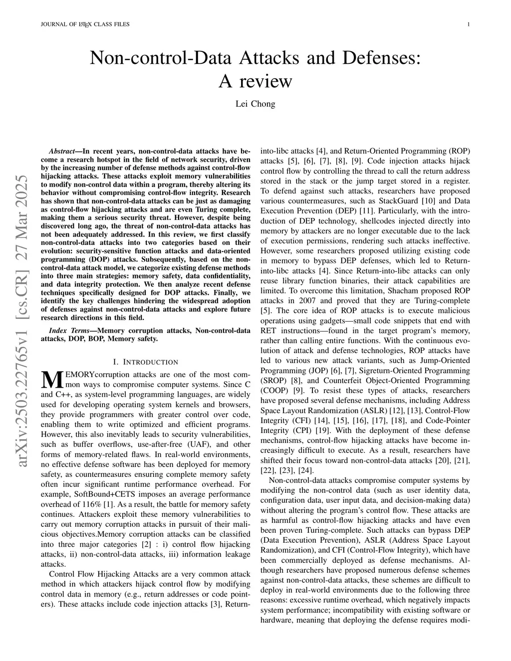 In recent years, non-control-data attacks have be come a research hotspot in the field of network security, drivenby the increasing number of defense methods against control-flowhijacking attacks. These attacks exploit memory vulnerabilitiesto modify non-control data within a program, thereby altering itsbehavior without compromising control-flow integrity. Researchhas shown that non-control-data attacks can be just as damagingas control-flow hijacking attacks and are even Turing complete,making them a serious security threat. However, despite beingdiscovered long ago, the threat of non-control-data attacks hasnot been adequately addressed. In this review, we first classifynon-control-data attacks into two categories based on theirevolution: security-sensitive function attacks and data-orientedprogramming (DOP) attacks. Subsequently, based on the non control-data attack model, we categorize existing defense methodsinto three main strategies: memory safety, data confidentiality,and data integrity protection. We then analyze recent defensetechniques specifically designed for DOP attacks. Finally, weidentify the key challenges hindering the widespread adoptionof defenses against non-control-data attacks and explore futureresearch directions in this field.