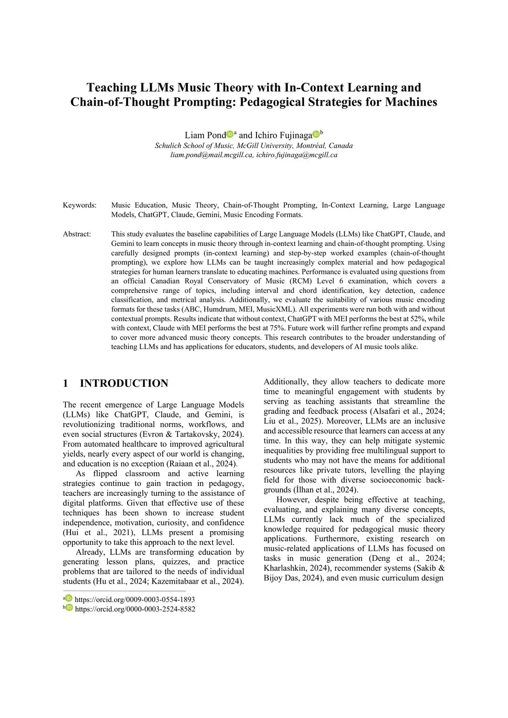 This study evaluates the baseline capabilities of Large Language Models (LLMs) like ChatGPT, Claude, and Gemini to learn concepts in music theory through in-context learning and chain-of-thought prompting. Using carefully designed prompts (in-context learning) and step-by-step worked examples (chain-of-thought prompting), we explore how LLMs can be taught increasingly complex material and how pedagogical strategies for human learners translate to educating machines. Performance is evaluated using questions from an official Canadian Royal Conservatory of Music (RCM) Level 6 examination, which covers a comprehensive range of topics, including interval and chord identification, key detection, cadence classification, and metrical analysis. Additionally, we evaluate the suitability of various music encoding formats for these tasks (ABC, Humdrum, MEI, MusicXML). All experiments were run both with and without contextual prompts. Results indicate that without context, ChatGPT with MEI performs the best at 52%, while with context, Claude with MEI performs the best at 75%. Future work will further refine prompts and expand to cover more advanced music theory concepts. This research contributes to the broader understanding of teaching LLMs and has applications for educators, students, and developers of AI music tools alike.