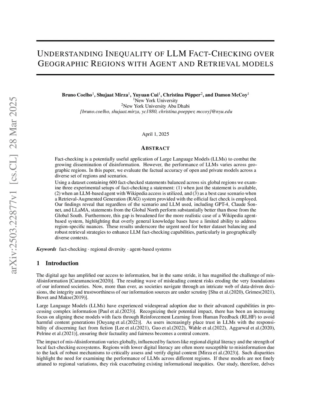 Understanding Inequality of LLM Fact-Checking over Geographic Regions with Agent and Retrieval models