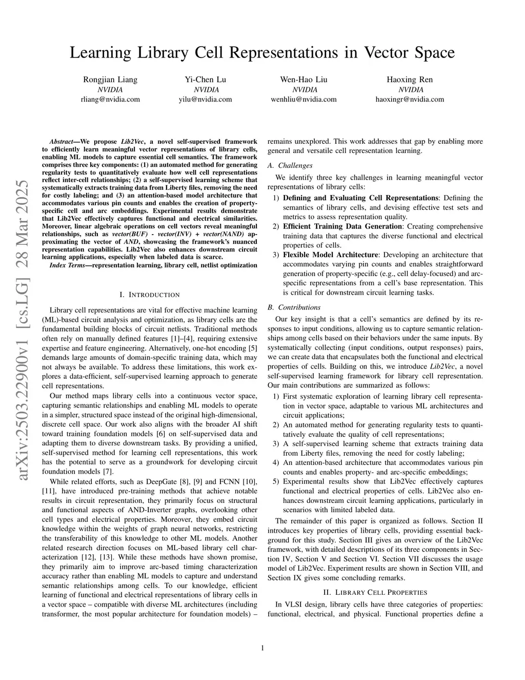 We propose Lib2Vec, a novel self-supervised framework to efficiently learn meaningful vector representations of library cells, enabling ML models to capture essential cell semantics. The framework comprises three key components: (1) an automated method for generating regularity tests to quantitatively evaluate how well cell representations reflect inter-cell relationships; (2) a self-supervised learning scheme that systematically extracts training data from Liberty files, removing the need for costly labeling; and (3) an attention-based model architecture that accommodates various pin counts and enables the creation of property-specific cell and arc embeddings. Experimental results demonstrate that Lib2Vec effectively captures functional and electrical similarities. Moreover, linear algebraic operations on cell vectors reveal meaningful relationships, such as vector(BUF) - vector(INV) + vector(NAND) ~ vector(AND), showcasing the framework's nuanced representation capabilities. Lib2Vec also enhances downstream circuit learning applications, especially when labeled data is scarce.