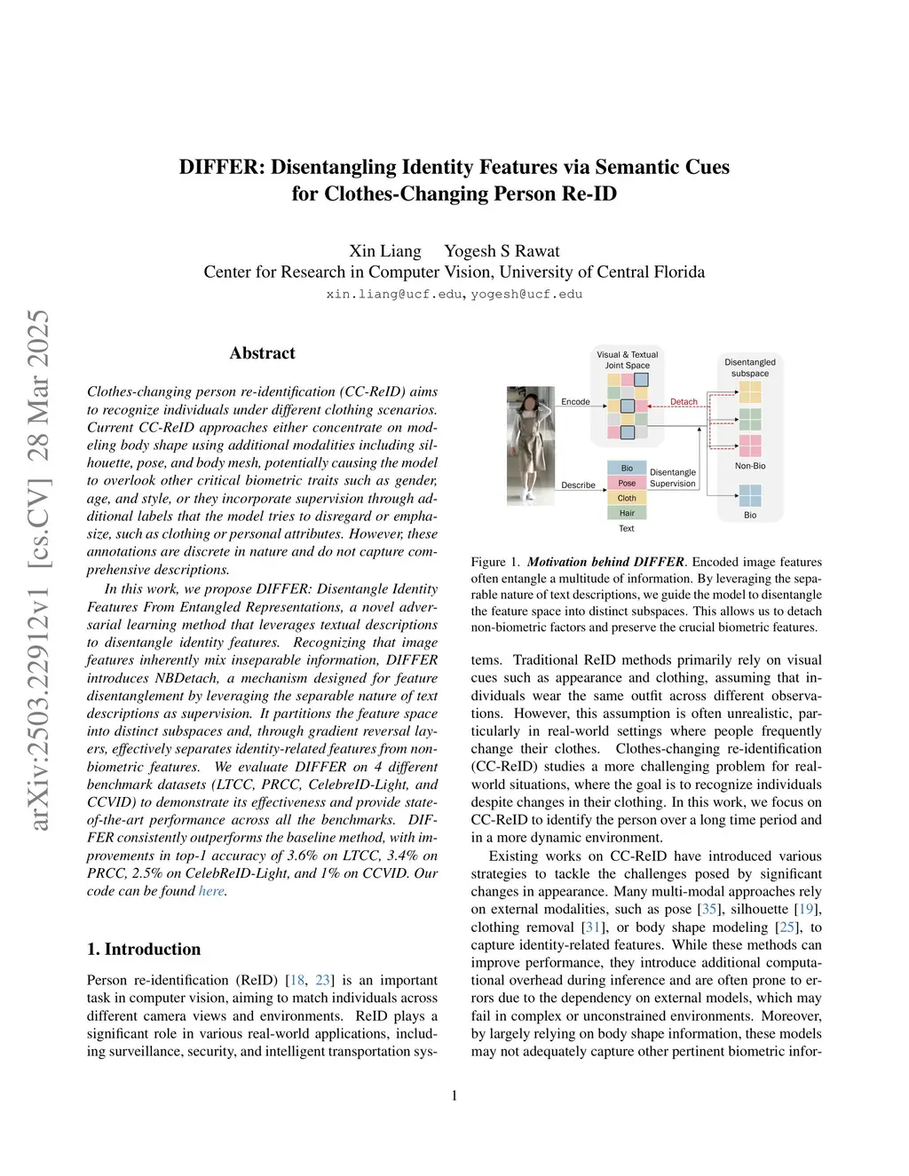 DIFFER: Disentangling Identity Features via Semantic Cues for Clothes-Changing Person Re-ID