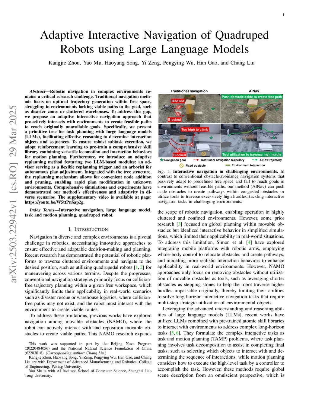 Robotic navigation in complex environments remains a critical research challenge. Traditional navigation methods focus on optimal trajectory generation within fixed free workspace, therefore struggling in environments lacking viable paths to the goal, such as disaster zones or cluttered warehouses. To address this problem, we propose AINav, an adaptive interactive navigation approach that proactively interacts with environments to create feasible paths to achieve originally unreachable goals. Specifically, we present a primitive skill tree for task planning with large language models (LLMs), facilitating effective reasoning to determine interaction objects and sequences. To ensure robust subtask execution, we adopt reinforcement learning to pre-train a comprehensive skill library containing versatile locomotion and interaction behaviors for motion planning. Furthermore, we introduce an adaptive replanning approach featuring two LLM-based modules: an advisor serving as a flexible replanning trigger and an arborist for autonomous plan adjustment. Integrated with the tree structure, the replanning mechanism allows for convenient node addition and pruning, enabling rapid plan adaptation in a priori unknown environments. Comprehensive simulations and experiments have demonstrated AINav's effectiveness and adaptivity in diverse scenarios. The supplementary video is available at:this https URL.