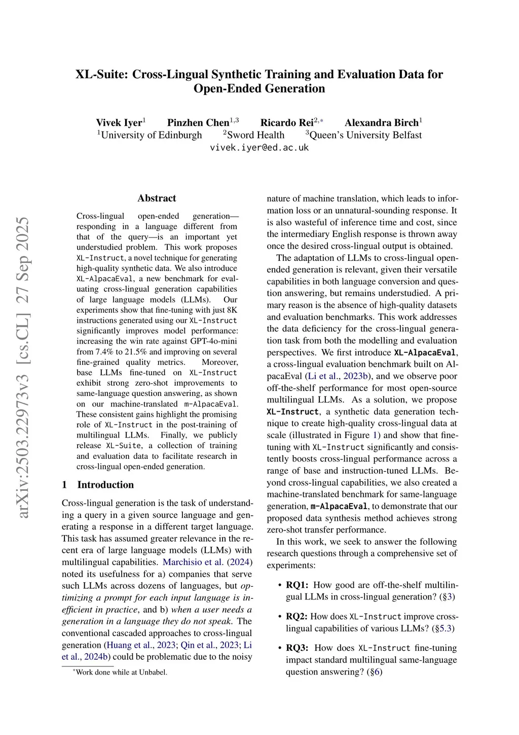 Cross-lingual open-ended generation - responding in a language different from that of the query - is an important yet understudied problem. This work proposes XL-Instruct, a novel technique for generating high-quality synthetic data, and introduces XL-AlpacaEval, a new benchmark for evaluating cross-lingual generation capabilities of large language models (LLMs). Our experiments show that fine-tuning with just 8K instructions generated using XL-Instruct significantly improves model performance, increasing the win rate against GPT-4o-Mini from 7.4% to 21.5% and improving on several fine-grained quality metrics. Moreover, base LLMs fine-tuned on XL-Instruct exhibit strong zero-shot improvements to question answering in the same language, as shown on our machine-translated m-AlpacaEval. These consistent gains highlight the promising role of XL-Instruct in the post-training of multilingual LLMs. Finally, we publicly release XL-Suite, a collection of training and evaluation data to facilitate research in cross-lingual open-ended generation.