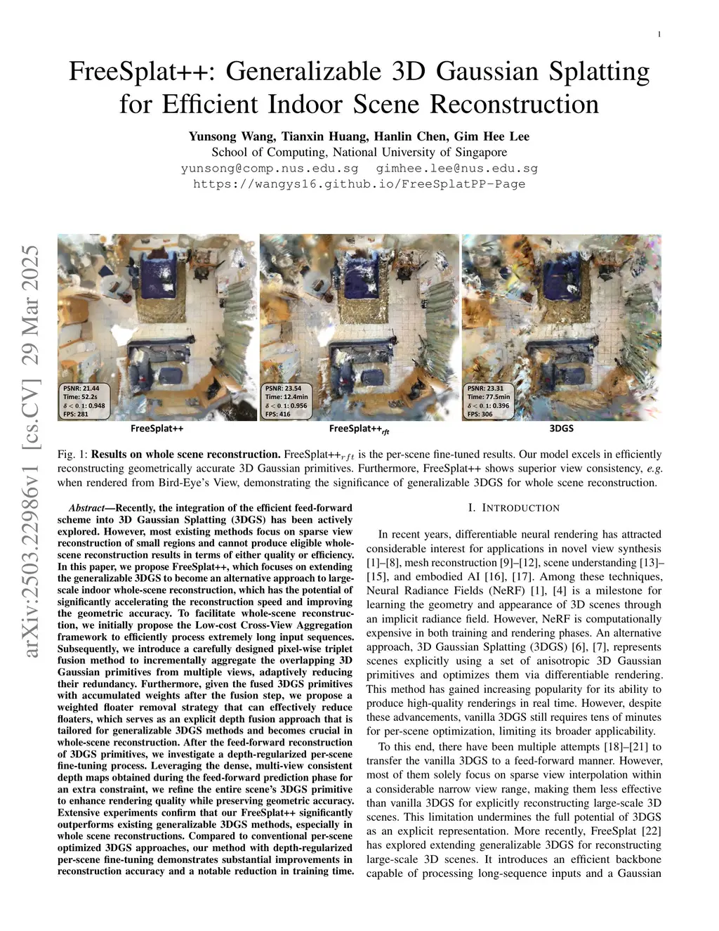 Recently, the integration of the efficient feed-forward scheme into 3D Gaussian Splatting (3DGS) has been actively explored. However, most existing methods focus on sparse view reconstruction of small regions and cannot produce eligible whole-scene reconstruction results in terms of either quality or efficiency. In this paper, we propose FreeSplat++, which focuses on extending the generalizable 3DGS to become an alternative approach to large-scale indoor whole-scene reconstruction, which has the potential of significantly accelerating the reconstruction speed and improving the geometric accuracy. To facilitate whole-scene reconstruction, we initially propose the Low-cost Cross-View Aggregation framework to efficiently process extremely long input sequences. Subsequently, we introduce a carefully designed pixel-wise triplet fusion method to incrementally aggregate the overlapping 3D Gaussian primitives from multiple views, adaptively reducing their redundancy. Furthermore, we propose a weighted floater removal strategy that can effectively reduce floaters, which serves as an explicit depth fusion approach that is crucial in whole-scene reconstruction. After the feed-forward reconstruction of 3DGS primitives, we investigate a depth-regularized per-scene fine-tuning process. Leveraging the dense, multi-view consistent depth maps obtained during the feed-forward prediction phase for an extra constraint, we refine the entire scene's 3DGS primitive to enhance rendering quality while preserving geometric accuracy. Extensive experiments confirm that our FreeSplat++ significantly outperforms existing generalizable 3DGS methods, especially in whole-scene reconstructions. Compared to conventional per-scene optimized 3DGS approaches, our method with depth-regularized per-scene fine-tuning demonstrates substantial improvements in reconstruction accuracy and a notable reduction in training time.