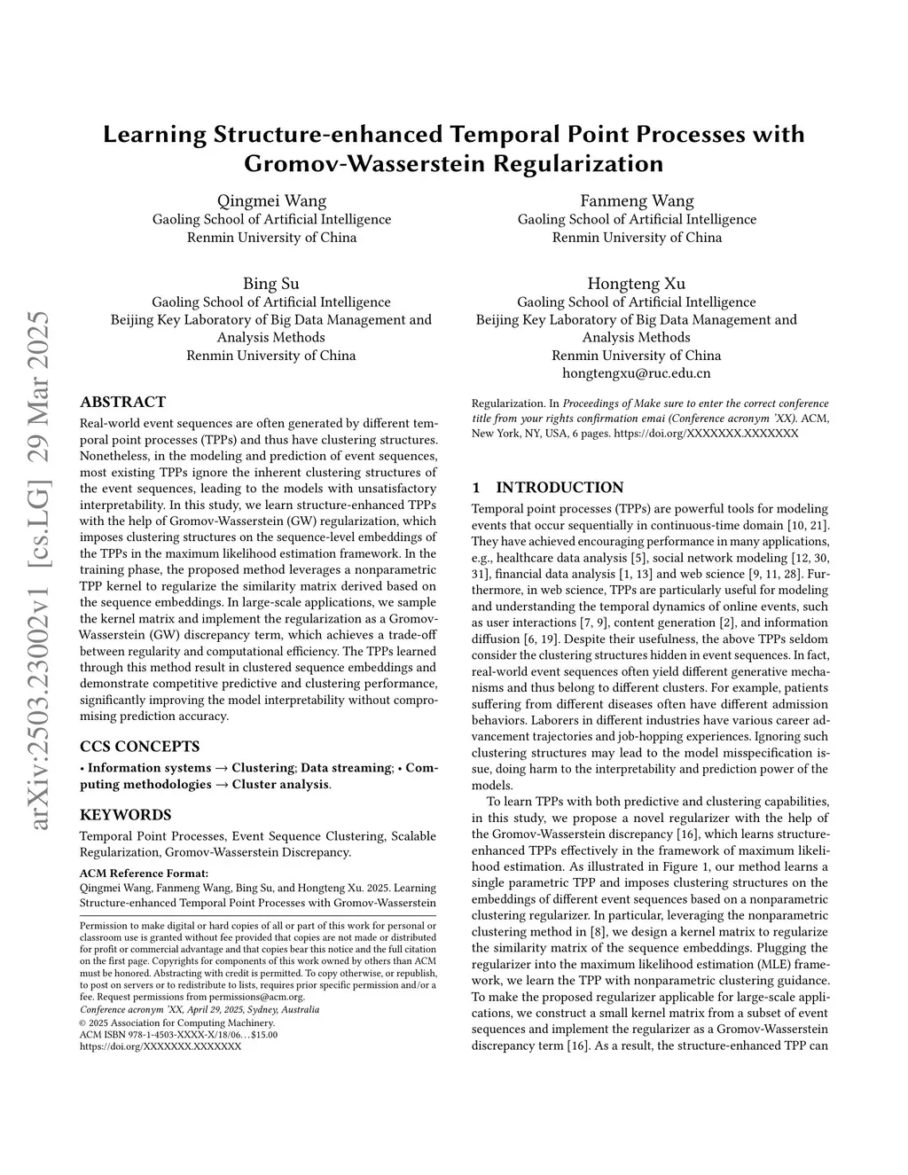 Real-world event sequences are often generated by different temporal point processes (TPPs) and thus have clustering structures. Nonetheless, in the modeling and prediction of event sequences, most existing TPPs ignore the inherent clustering structures of the event sequences, leading to the models with unsatisfactory interpretability. In this study, we learn structure-enhanced TPPs with the help of Gromov-Wasserstein (GW) regularization, which imposes clustering structures on the sequence-level embeddings of the TPPs in the maximum likelihood estimationthis http URLthe training phase, the proposed method leverages a nonparametric TPP kernel to regularize the similarity matrix derived based on the sequence embeddings. In large-scale applications, we sample the kernel matrix and implement the regularization as a Gromov-Wasserstein (GW) discrepancy term, which achieves a trade-off between regularity and computationalthis http URLTPPs learned through this method result in clustered sequence embeddings and demonstrate competitive predictive and clustering performance, significantly improving the model interpretability without compromising prediction accuracy.