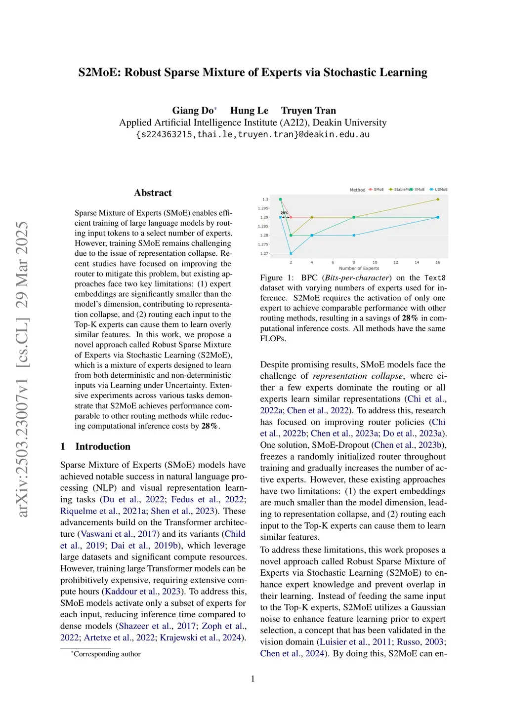 Sparse Mixture of Experts (SMoE) enables efficient training of large language models by routing input tokens to a select number of experts. However, training SMoE remains challenging due to the issue of representation collapse. Recent studies have focused on improving the router to mitigate this problem, but existing approaches face two key limitations: (1) expert embeddings are significantly smaller than the model's dimension, contributing to representation collapse, and (2) routing each input to the Top-K experts can cause them to learn overly similar features. In this work, we propose a novel approach called Robust Sparse Mixture of Experts via Stochastic Learning (S2MoE), which is a mixture of experts designed to learn from both deterministic and non-deterministic inputs via Learning under Uncertainty. Extensive experiments across various tasks demonstrate that S2MoE achieves performance comparable to other routing methods while reducing computational inference costs by 28%.