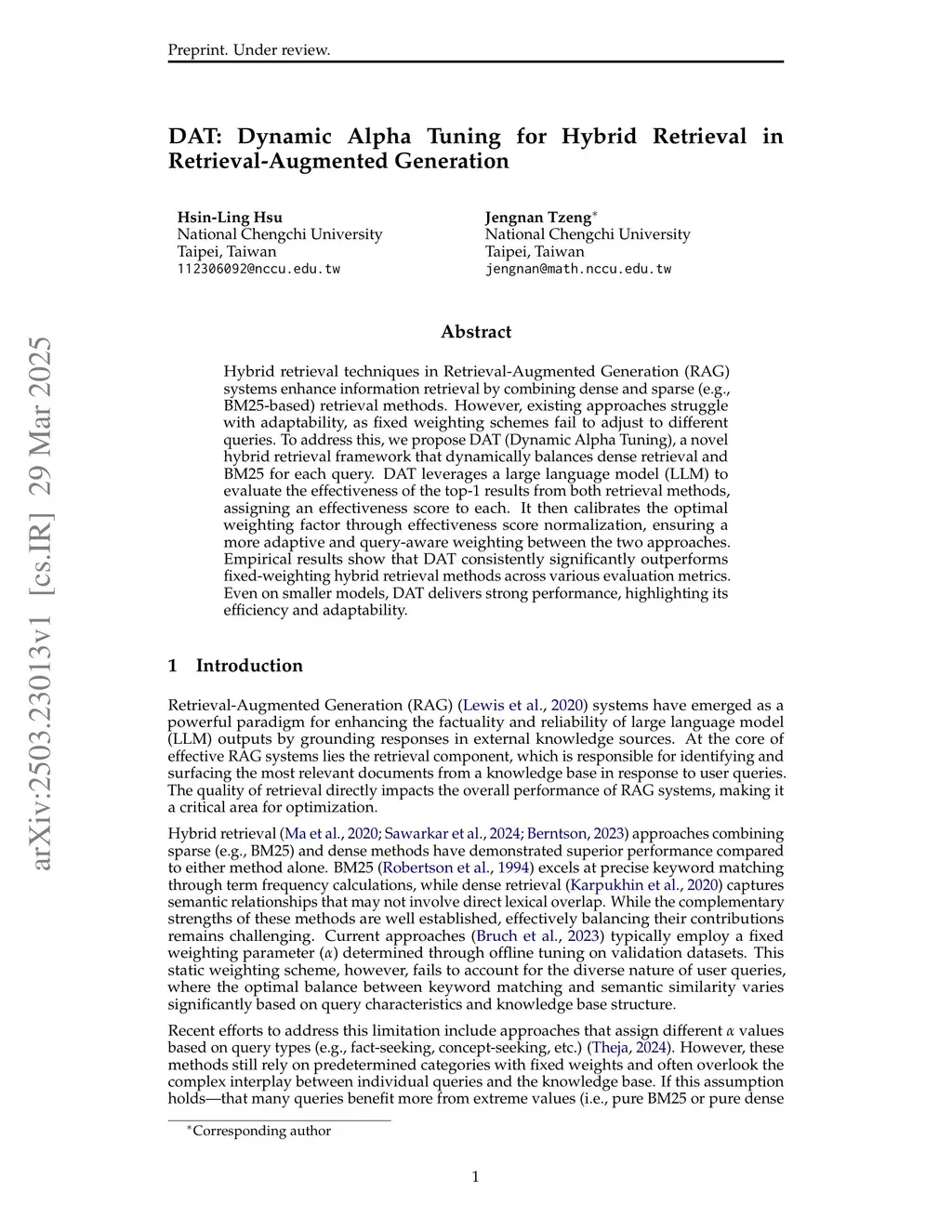 DAT: Dynamic Alpha Tuning for Hybrid Retrieval in Retrieval-Augmented Generation