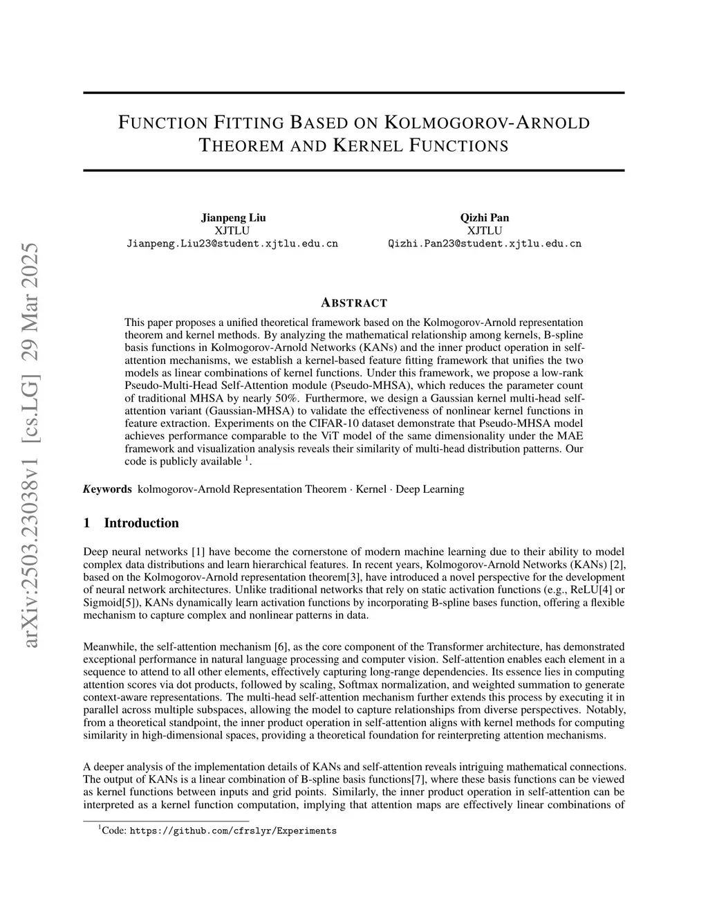 This paper proposes a unified theoretical framework based on the Kolmogorov-Arnold representation theorem and kernel methods. By analyzing the mathematical relationship among kernels, B-spline basis functions in Kolmogorov-Arnold Networks (KANs) and the inner product operation in self-attention mechanisms, we establish a kernel-based feature fitting framework that unifies the two models as linear combinations of kernel functions. Under this framework, we propose a low-rank Pseudo-Multi-Head Self-Attention module (Pseudo-MHSA), which reduces the parameter count of traditional MHSA by nearly 50\%. Furthermore, we design a Gaussian kernel multi-head self-attention variant (Gaussian-MHSA) to validate the effectiveness of nonlinear kernel functions in feature extraction. Experiments on the CIFAR-10 dataset demonstrate that Pseudo-MHSA model achieves performance comparable to the ViT model of the same dimensionality under the MAE framework and visualization analysis reveals their similarity of multi-head distribution patterns. Our code is publicly available.