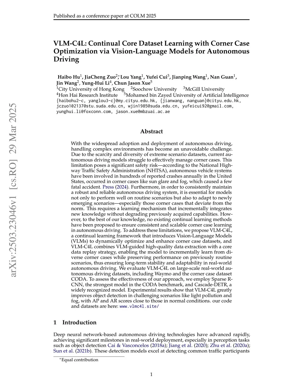 VLM-C4L: Continual Core Dataset Learning with Corner Case Optimization via Vision-Language Models for Autonomous Driving