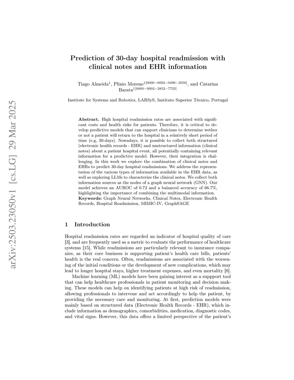 High hospital readmission rates are associated with significant costs and health risks for patients. Therefore, it is critical to develop predictive models that can support clinicians to determine whether or not a patient will return to the hospital in a relatively short period of time (e.g, 30-days). Nowadays, it is possible to collect both structured (electronic health records - EHR) and unstructured information (clinical notes) about a patient hospital event, all potentially containing relevant information for a predictive model. However, their integration is challenging. In this work we explore the combination of clinical notes and EHRs to predict 30-day hospital readmissions. We address the representation of the various types of information available in the EHR data, as well as exploring LLMs to characterize the clinical notes. We collect both information sources as the nodes of a graph neural network (GNN). Our model achieves an AUROC of 0.72 and a balanced accuracy of 66.7\%, highlighting the importance of combining the multimodal information.