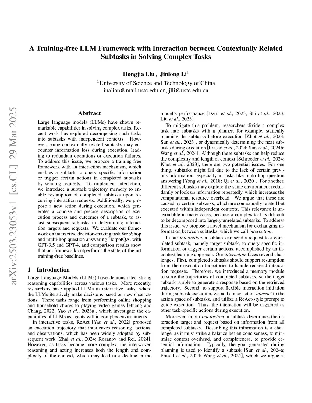A Training-free LLM Framework with Interaction between Contextually Related Subtasks in Solving Complex Tasks