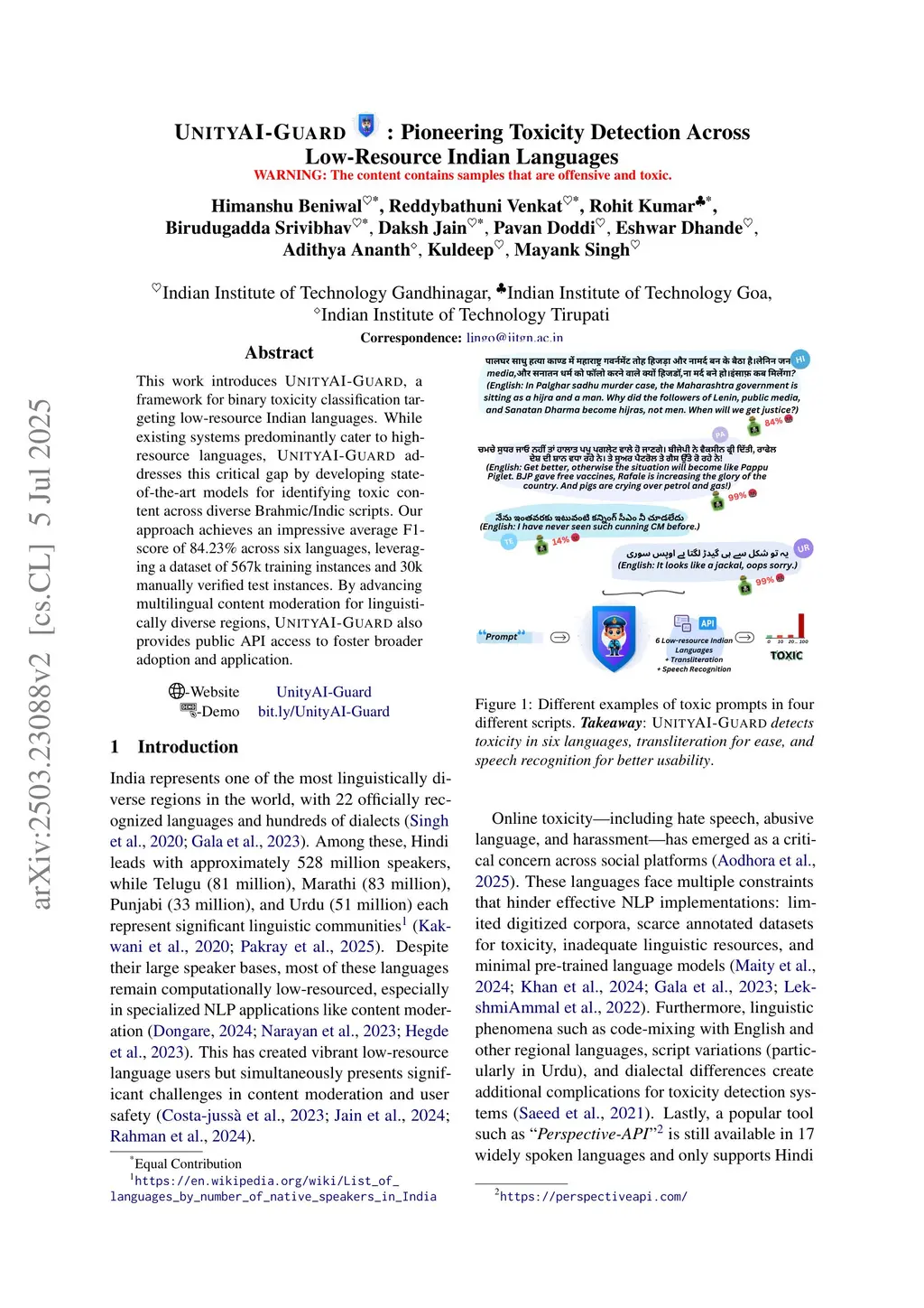This work introduces UnityAI-Guard, a framework for binary toxicity classification targeting low-resource Indian languages. While existing systems predominantly cater to high-resource languages, UnityAI-Guard addresses this critical gap by developing state-of-the-art models for identifying toxic content across diverse Brahmic/Indic scripts. Our approach achieves an impressive average F1-score of 84.23% across seven languages, leveraging a dataset of 567k training instances and 30k manually verified test instances. By advancing multilingual content moderation for linguistically diverse regions, UnityAI-Guard also provides public API access to foster broader adoption and application.
