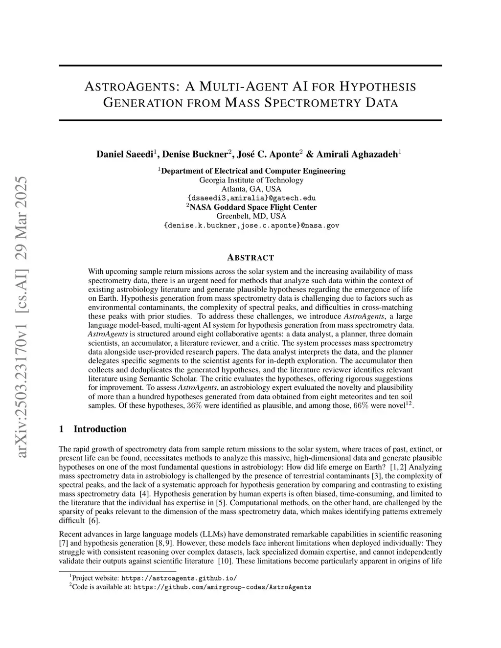 With upcoming sample return missions across the solar system and the increasing availability of mass spectrometry data, there is an urgent need for methods that analyze such data within the context of existing astrobiology literature and generate plausible hypotheses regarding the emergence of life on Earth. Hypothesis generation from mass spectrometry data is challenging due to factors such as environmental contaminants, the complexity of spectral peaks, and difficulties in cross-matching these peaks with prior studies. To address these challenges, we introduce AstroAgents, a large language model-based, multi-agent AI system for hypothesis generation from mass spectrometry data. AstroAgents is structured around eight collaborative agents: a data analyst, a planner, three domain scientists, an accumulator, a literature reviewer, and a critic. The system processes mass spectrometry data alongside user-provided research papers. The data analyst interprets the data, and the planner delegates specific segments to the scientist agents for in-depth exploration. The accumulator then collects and deduplicates the generated hypotheses, and the literature reviewer identifies relevant literature using Semantic Scholar. The critic evaluates the hypotheses, offering rigorous suggestions for improvement. To assess AstroAgents, an astrobiology expert evaluated the novelty and plausibility of more than a hundred hypotheses generated from data obtained from eight meteorites and ten soil samples. Of these hypotheses, 36% were identified as plausible, and among those, 66% were novel. Project website:this https URL